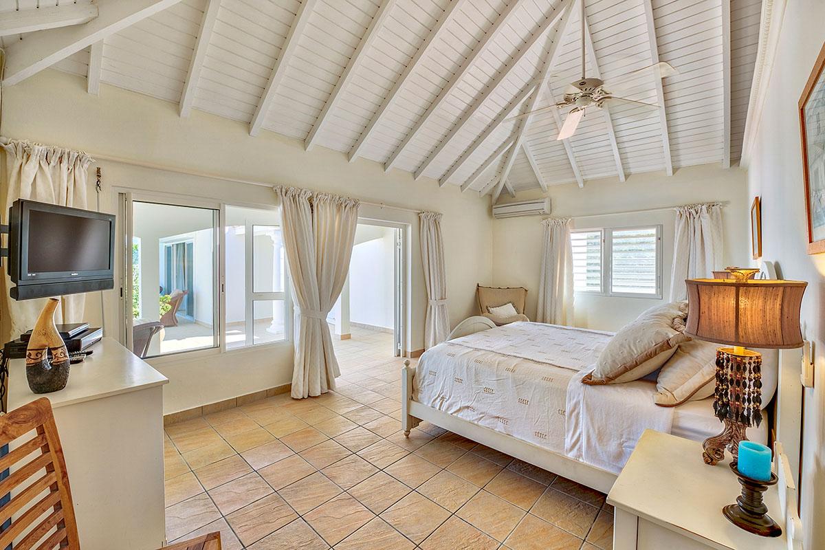 - Bedroom 1: King bed, private bathroom with shower, AC, ceiling fan, TV