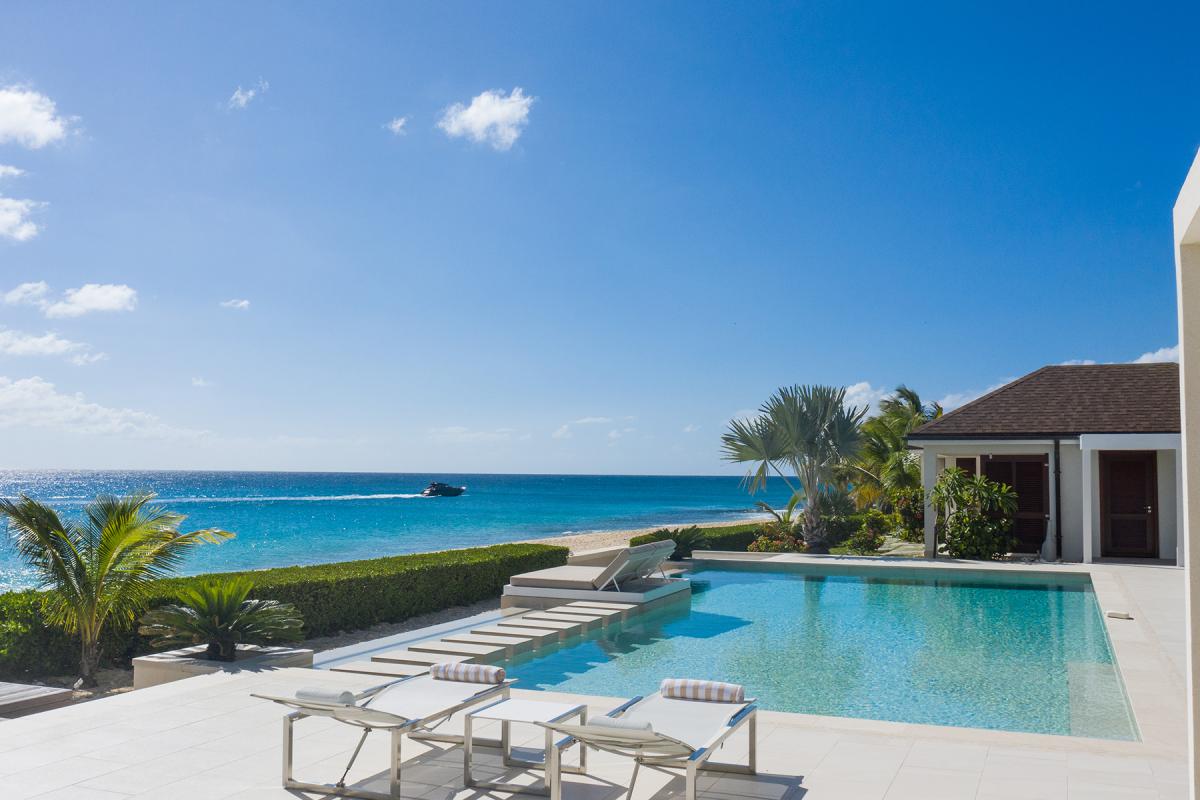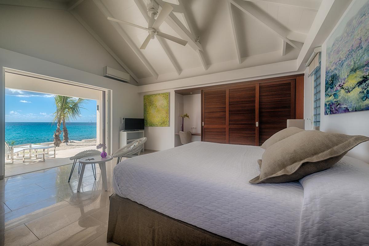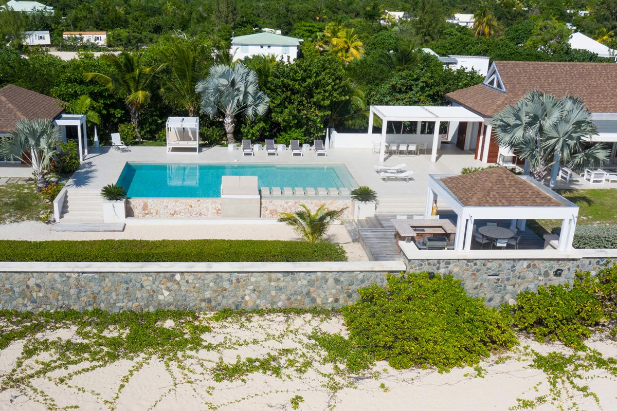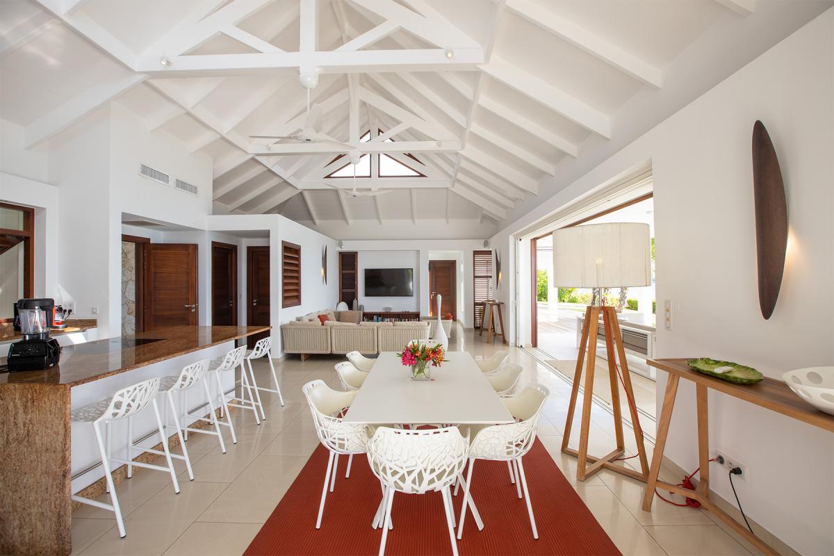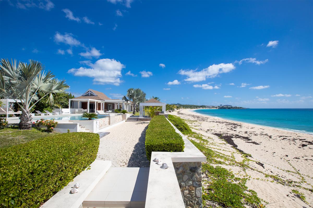 Walking through the front door of this luxury 4 bedroom beachfront estate, all you see is the turquoise of the Caribbean Sea, a very welcome first view to your stay at Turtle Nest. Situated along the shores of Baie Longue Beach in St Martin’s Terres Basses, you’ll have views of the water from every seat in the villa. An open concept main house extends to the terrace where you’ll find a covered patio for dining, a gazebo with beach bar and an outdoor living area with views down the beach to the famous La Samanna resort. Want more lounging areas?! Daybeds surround the large pool and what better way to relax than to lay back on your own lounger situated right on the edge of the infinity pool. The main interior living area boasts high ceilings and modern furnishings done in natural tones with pleasing accent colors. The spacious kitchen comes fully equipped with a nearby formal dining room, but be sure to take advantage of the barbecue and alfresco dining area on the gazebo for a casual meal outdoors. Up to 8 guests can be accommodated in this villa with 4 equal sized bedrooms all with en-suite bathrooms. Each private bedroom has an ocean facing view, air conditioning, TV with Netflix and Wifi access. From here, you’re just 15 minutes away from the airport, and only 10 to the nearest grocery store and restaurants. Perhaps the best feature is the villa’s direct access onto Baie Longue beach—it’s an ideal spot for sun lounging, snorkeling or building sand castles. The beautiful colonial buildings and fine dining of Marigot are also a quick drive, while serious shoppers will enjoy the duty-free haven of Philipsburg.