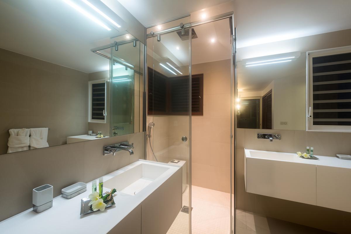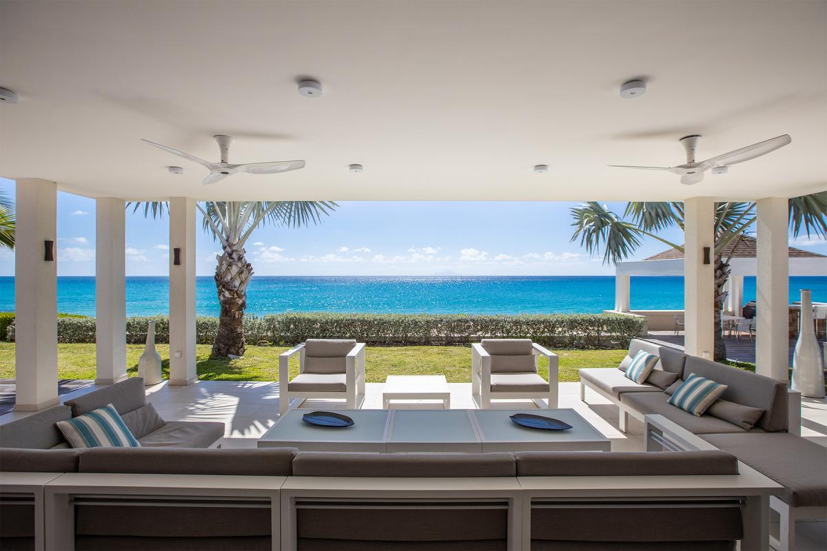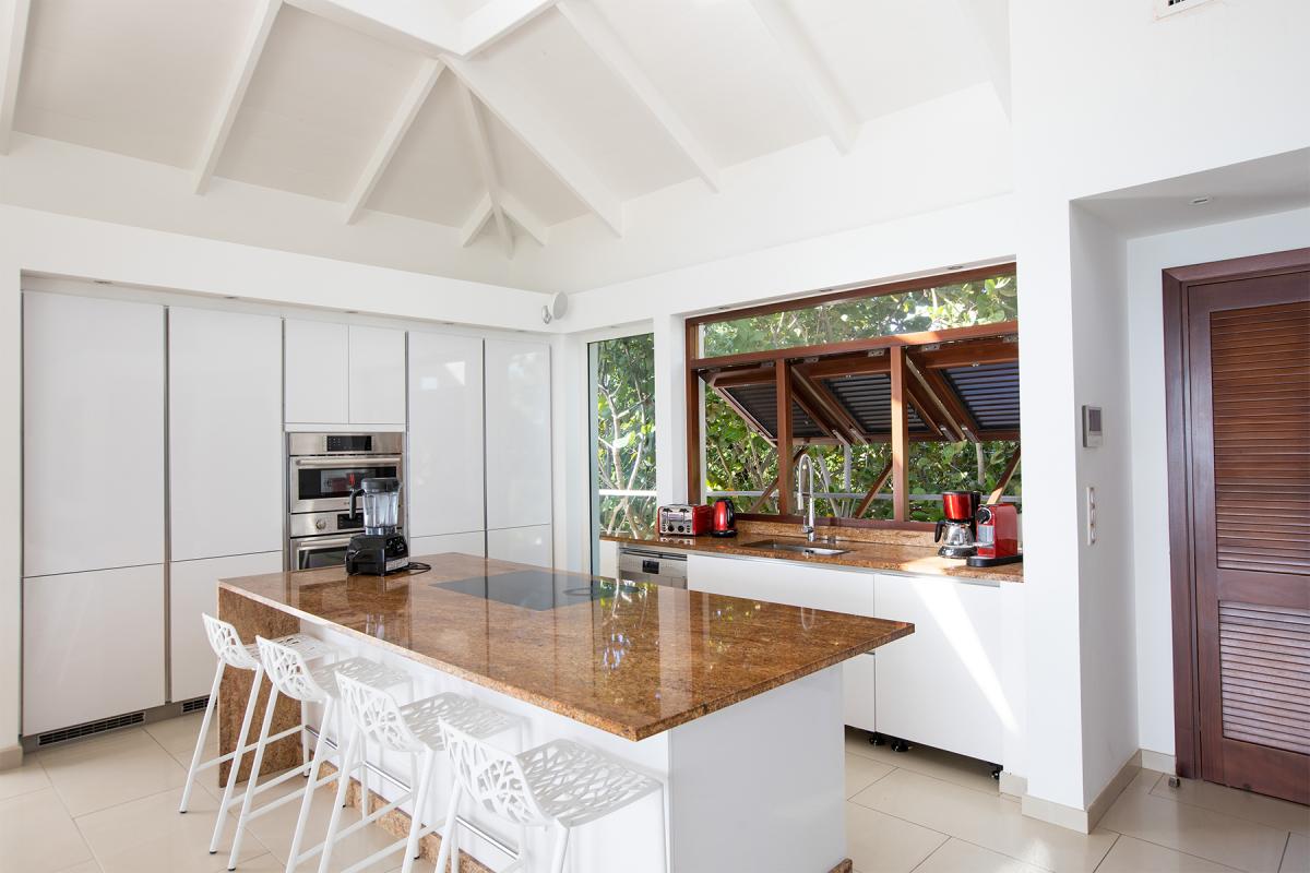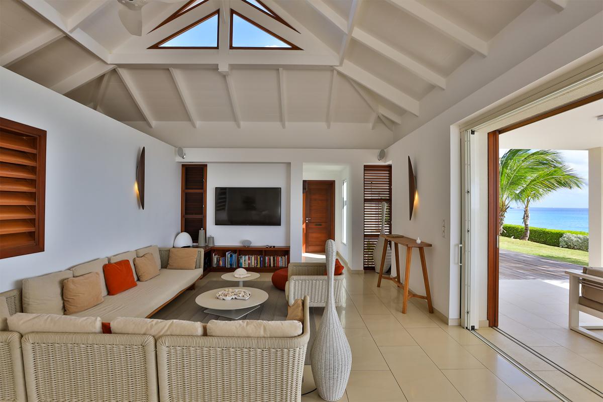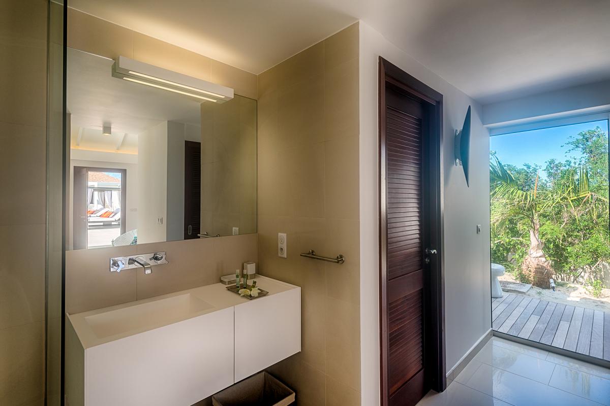 Walking through the front door of this luxury 4 bedroom beachfront estate, all you see is the turquoise of the Caribbean Sea, a very welcome first view to your stay at Turtle Nest. Situated along the shores of Baie Longue Beach in St Martin’s Terres Basses, you’ll have views of the water from every seat in the villa. An open concept main house extends to the terrace where you’ll find a covered patio for dining, a gazebo with beach bar and an outdoor living area with views down the beach to the famous La Samanna resort. Want more lounging areas?! Daybeds surround the large pool and what better way to relax than to lay back on your own lounger situated right on the edge of the infinity pool. The main interior living area boasts high ceilings and modern furnishings done in natural tones with pleasing accent colors. The spacious kitchen comes fully equipped with a nearby formal dining room, but be sure to take advantage of the barbecue and alfresco dining area on the gazebo for a casual meal outdoors. Up to 8 guests can be accommodated in this villa with 4 equal sized bedrooms all with en-suite bathrooms. Each private bedroom has an ocean facing view, air conditioning, TV with Netflix and Wifi access. From here, you’re just 15 minutes away from the airport, and only 10 to the nearest grocery store and restaurants. Perhaps the best feature is the villa’s direct access onto Baie Longue beach—it’s an ideal spot for sun lounging, snorkeling or building sand castles. The beautiful colonial buildings and fine dining of Marigot are also a quick drive, while serious shoppers will enjoy the duty-free haven of Philipsburg.