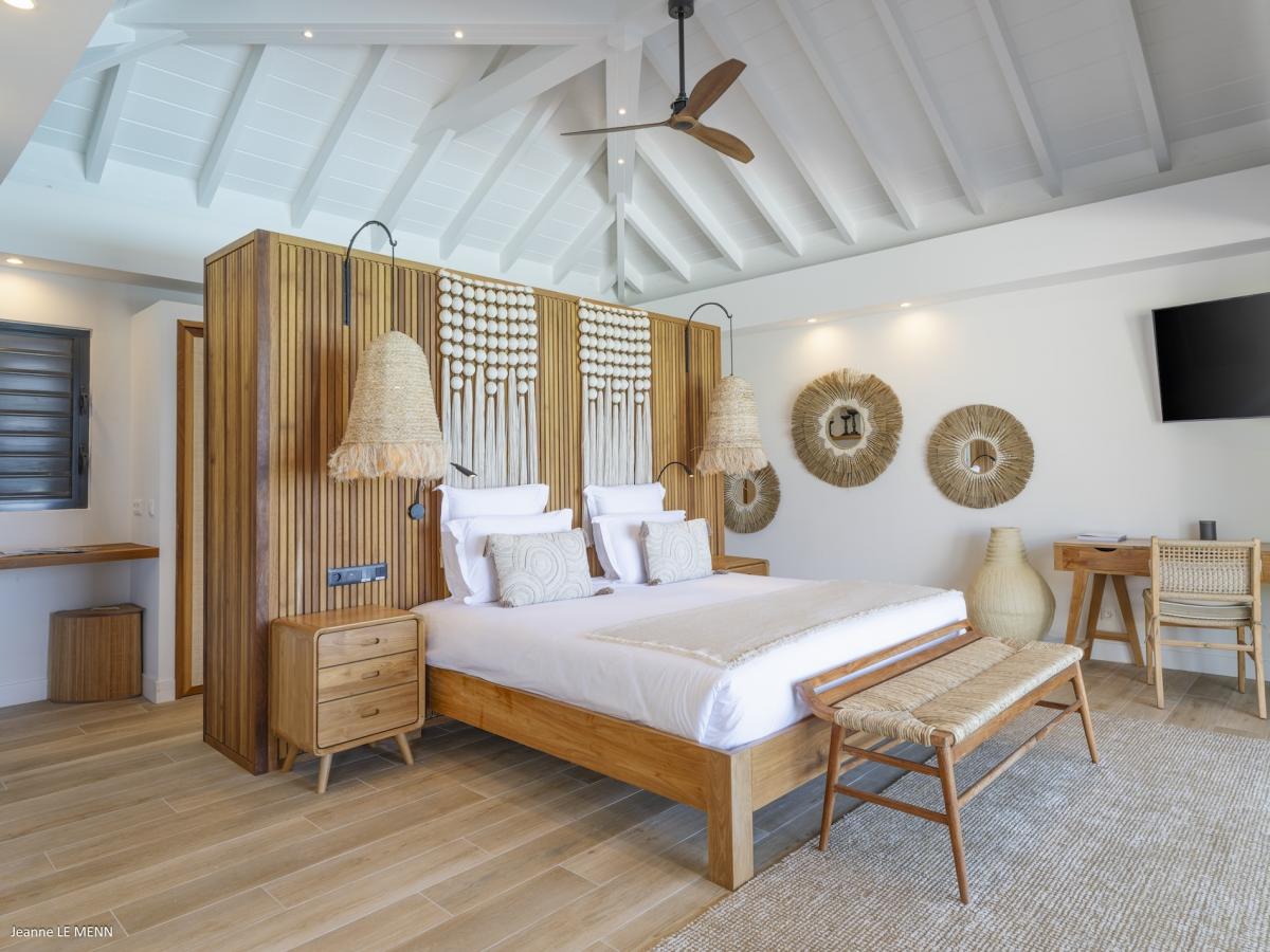 Bedroom 5: This room is equipped with a king-sized bed, a fan, air conditioning, a TV, a safe, an ocean view, and an ensuite bathroom.