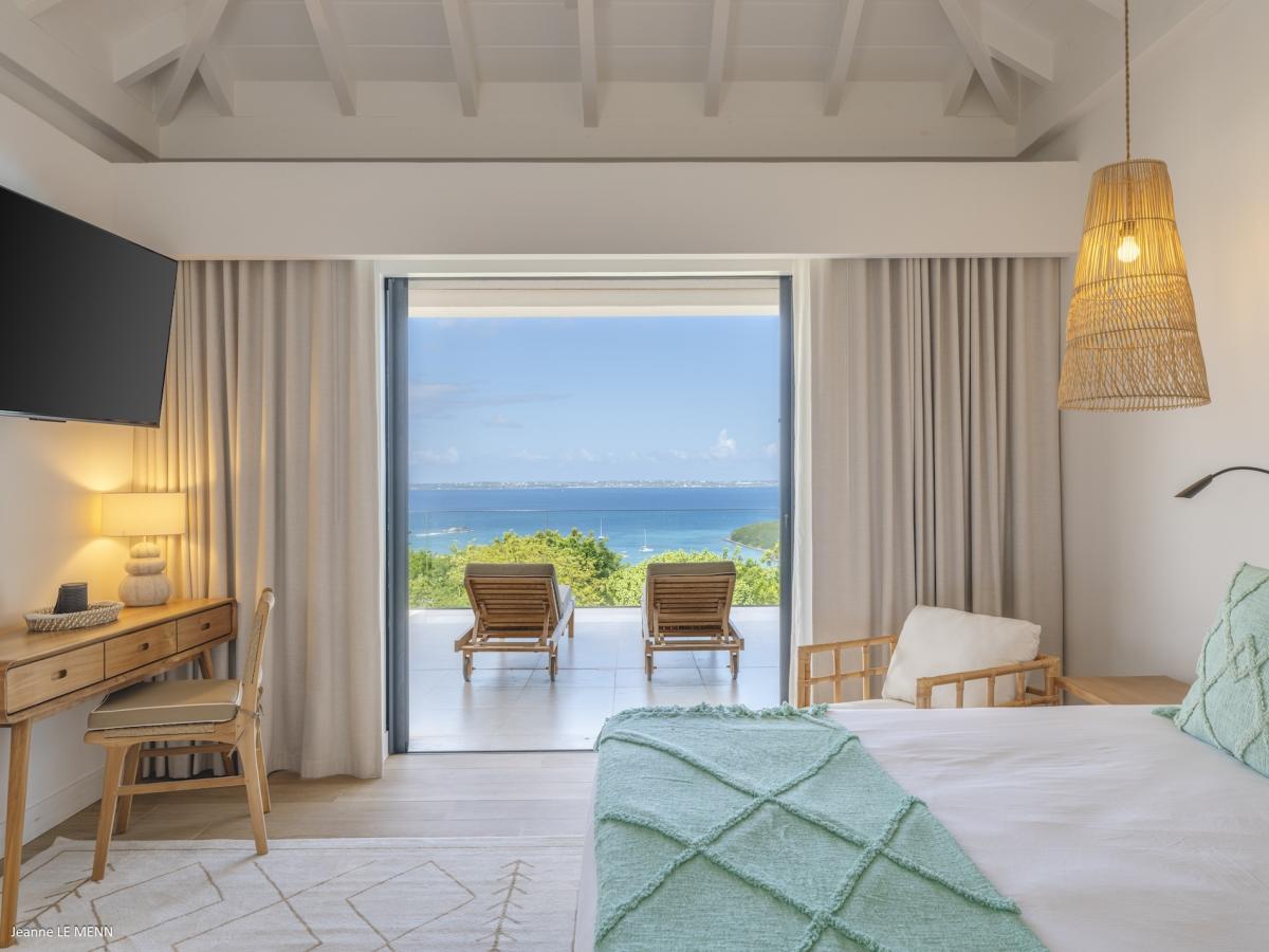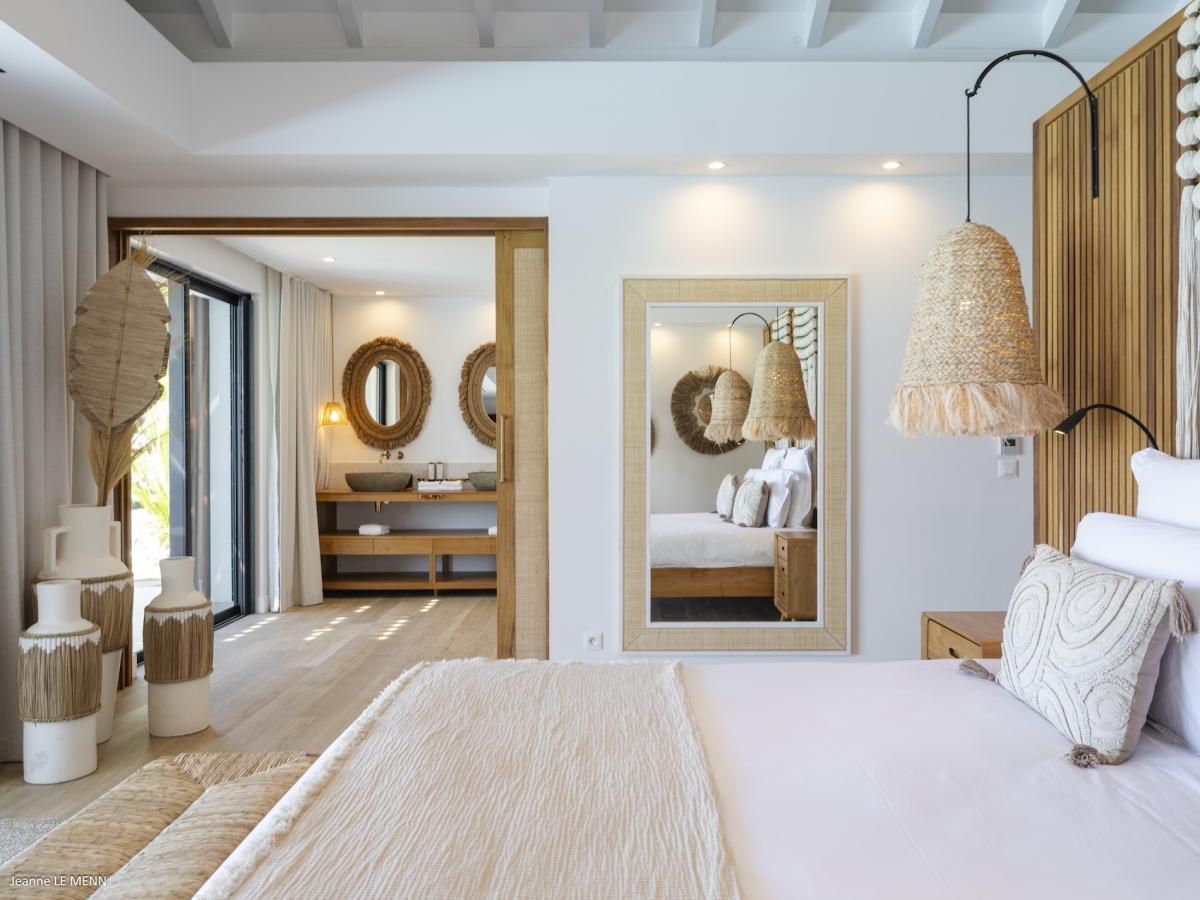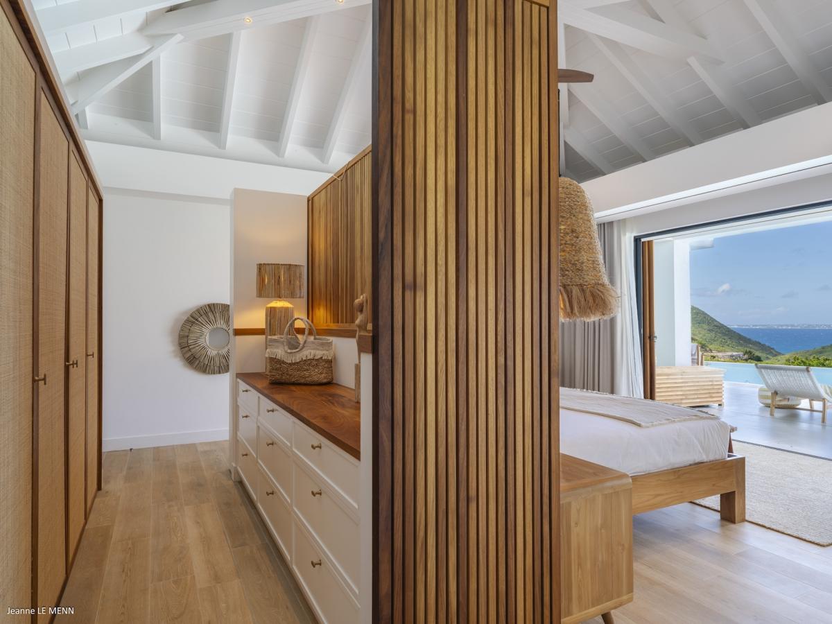 Each of the five bedrooms provides unobstructed views of the horizon and complete privacy. Three of the bedrooms are on the same level as the main living and the remaining two are accessible via a small staircase beside the pool, open onto private terraces. All bedrooms have bright ensuite bathrooms featuring a walk-in closet.