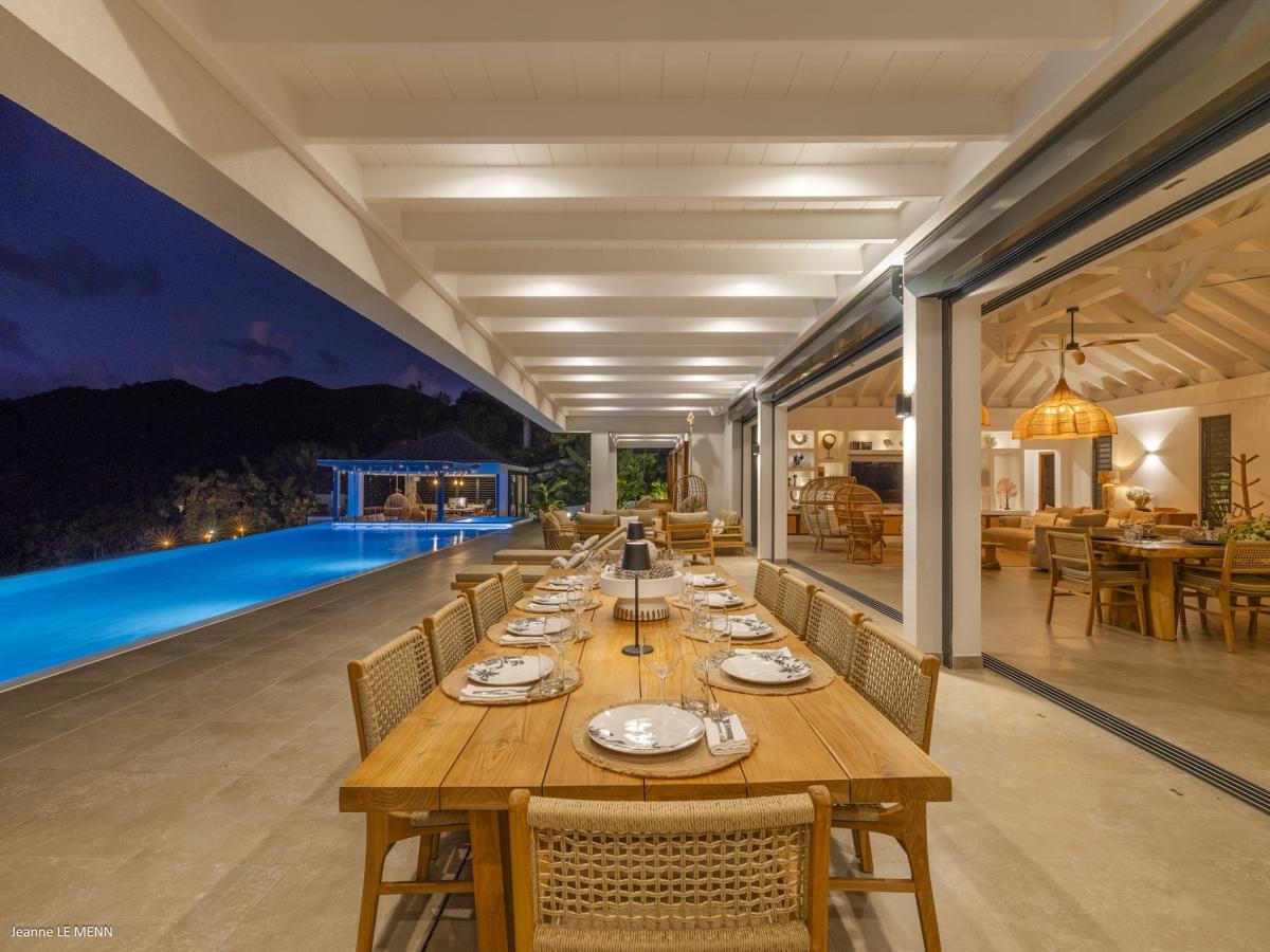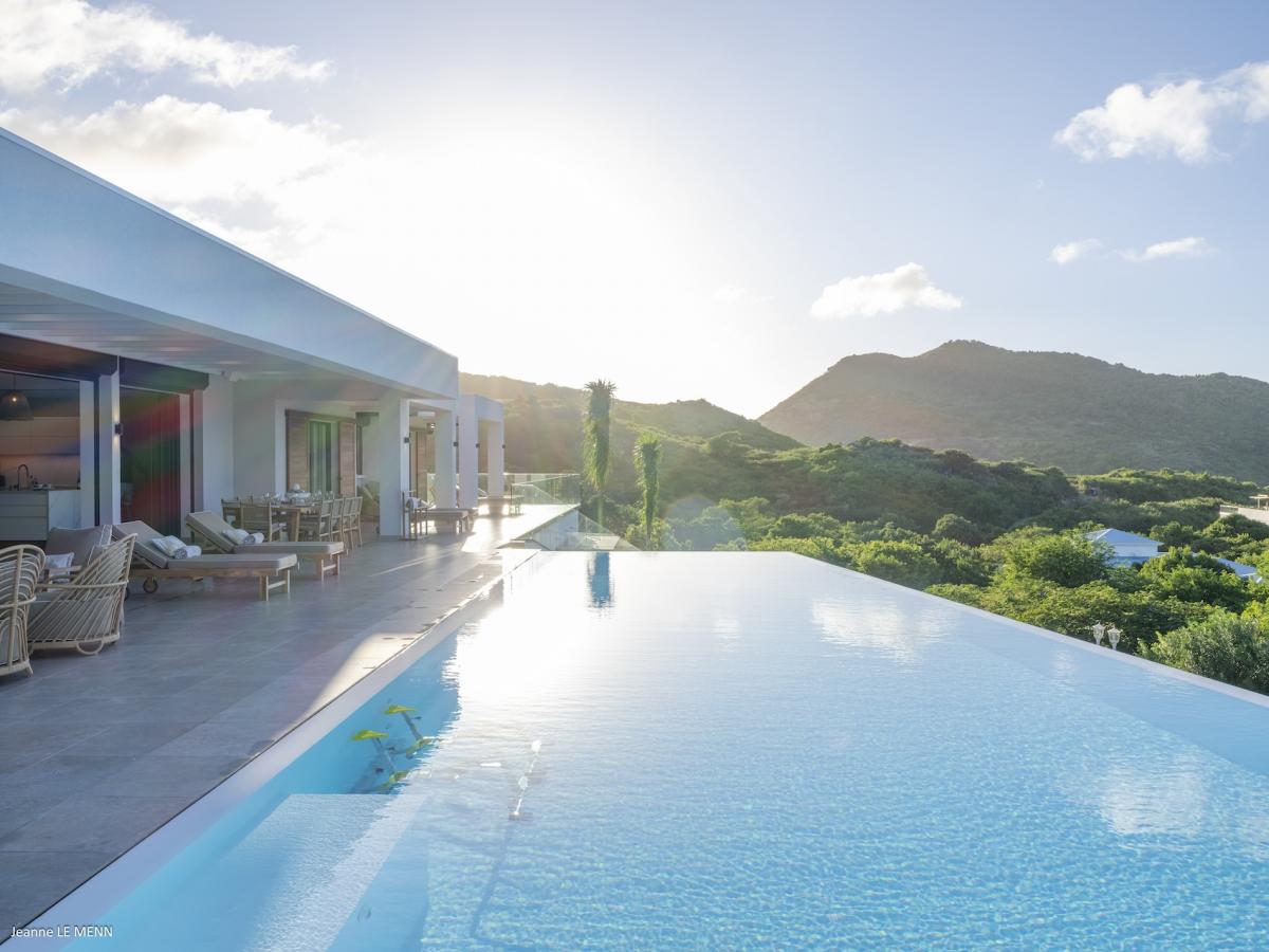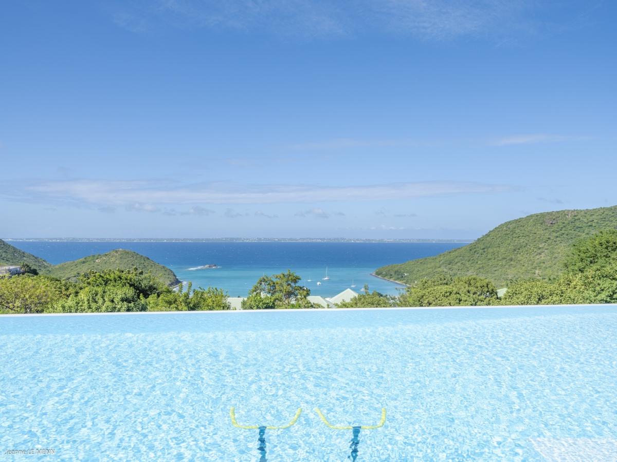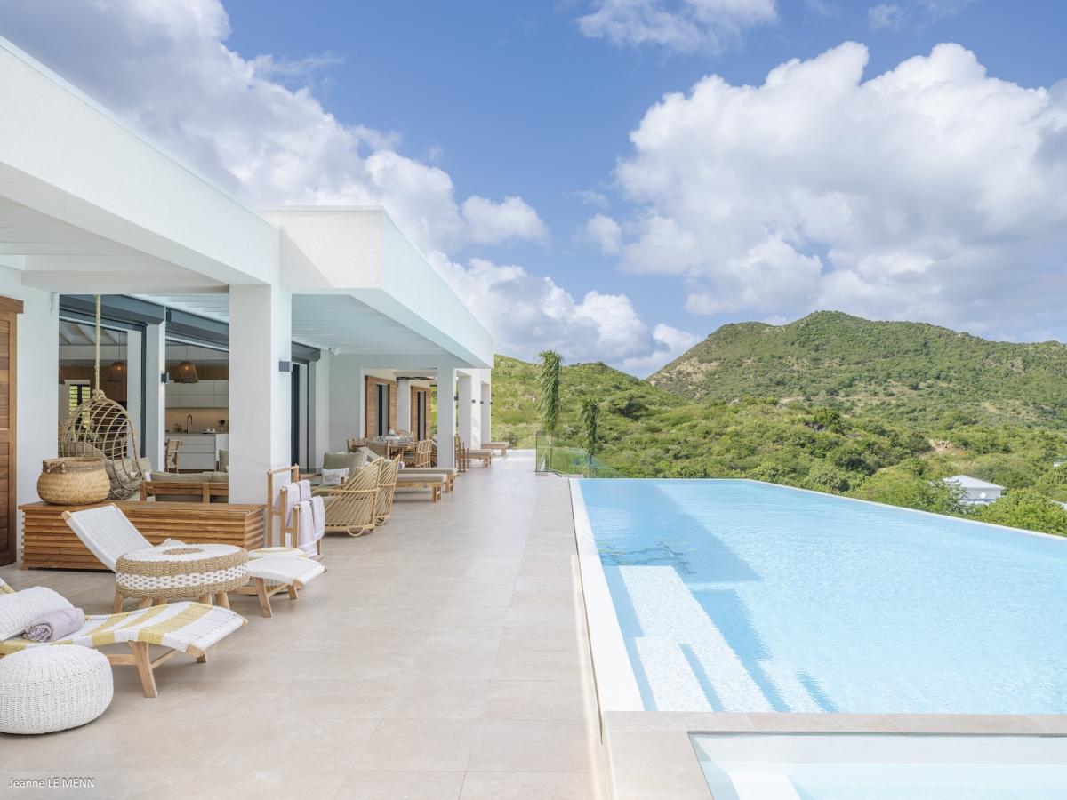 Villa Abaca is an exceptional St Martin villa rental nestled in the heights of Anse Marcel. It is a stunning five-bedroom residence offering breathtaking ocean views and seamless indoor-outdoor living. This luxurious St Martin villa features an expansive living room that connects to an infinity pool, creating a harmonious space filled with natural light.