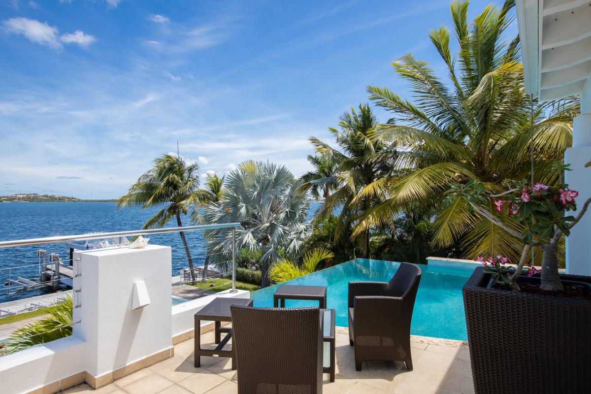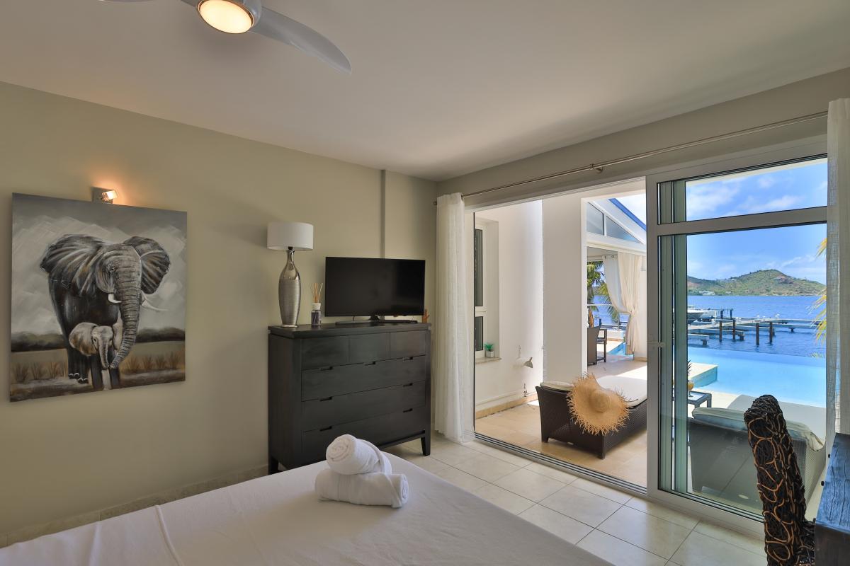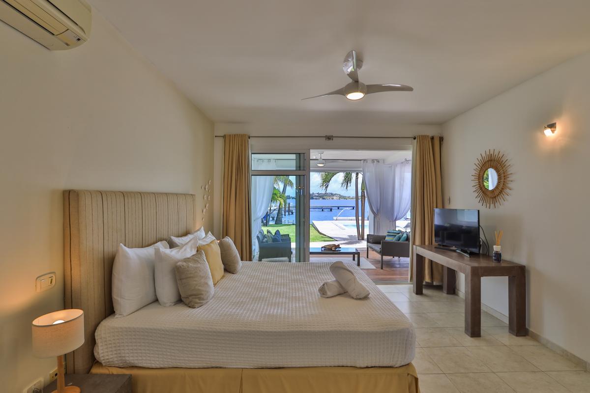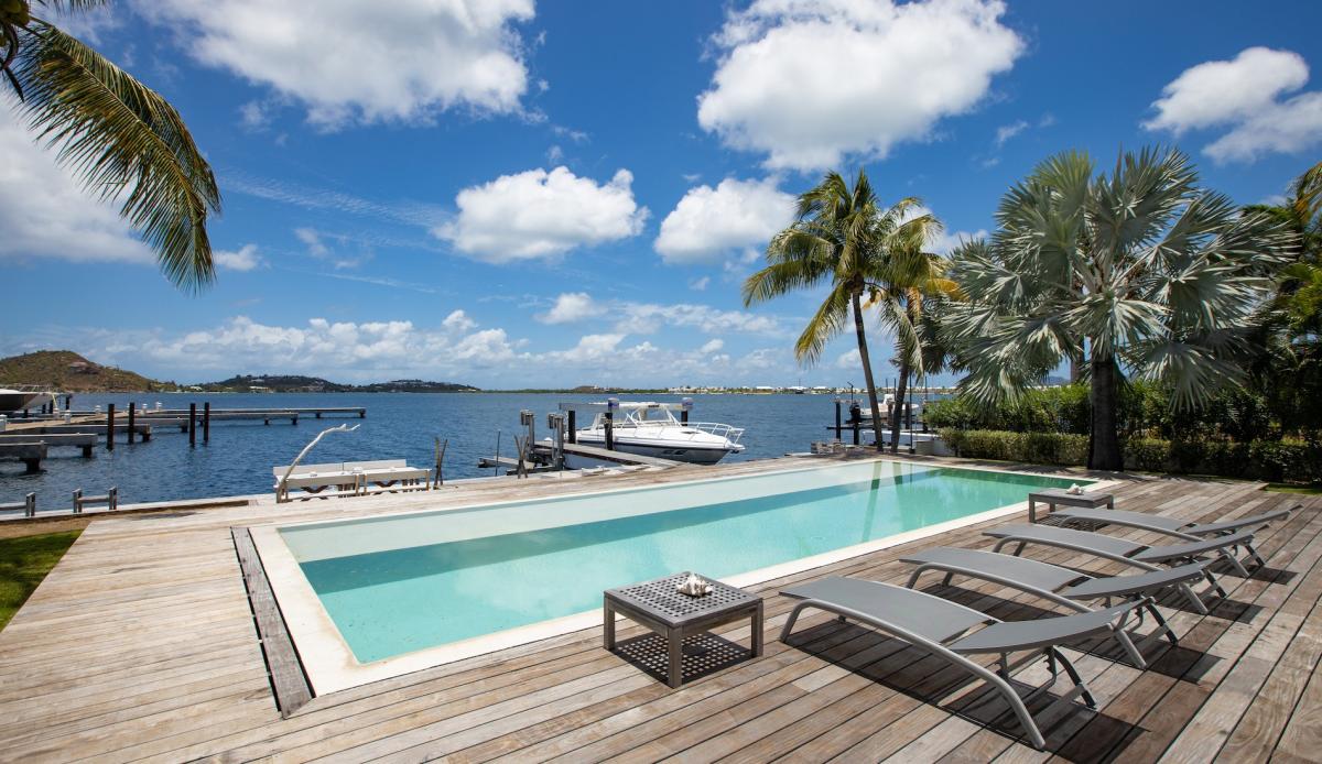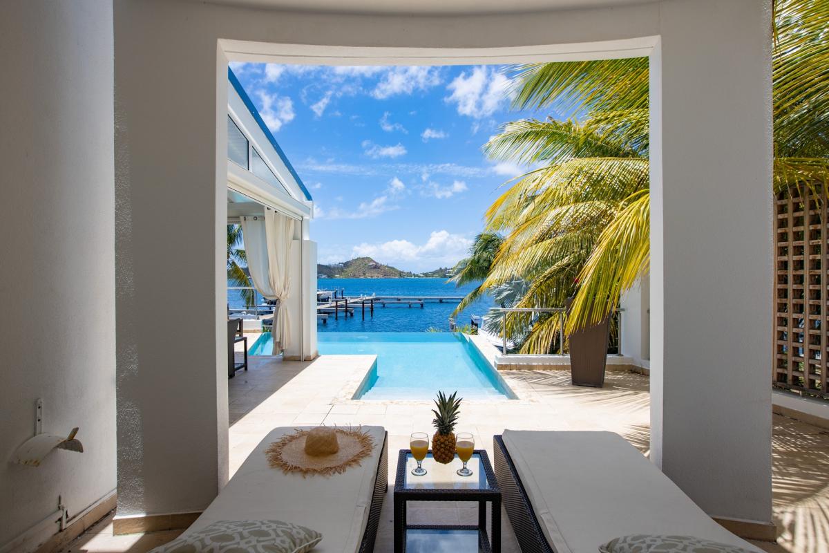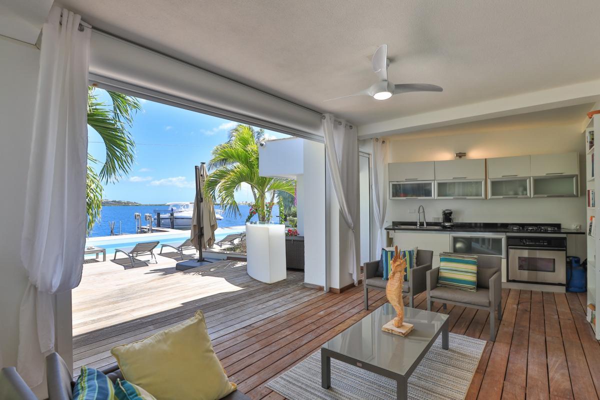 Villa Abracadabra is a luxurious property located in the exclusive Aquamarina area of Saint Martin, offering breathtaking views of the lagoon from its private dock. This St. Martin villa features five spacious bedrooms, four of which have lagoon views, dressing rooms, and ensuite bathrooms, while the fifth also offers an ensuite bathroom. Each bedroom is equipped with a Smart TV, ensuring comfort and entertainment for all guests. The living room opens to a covered terrace overlooking the lagoon and is equipped with fans, providing a cool and relaxing atmosphere. The large, fully fitted kitchen also offers stunning views, making it a perfect spot for cooking and socializing.