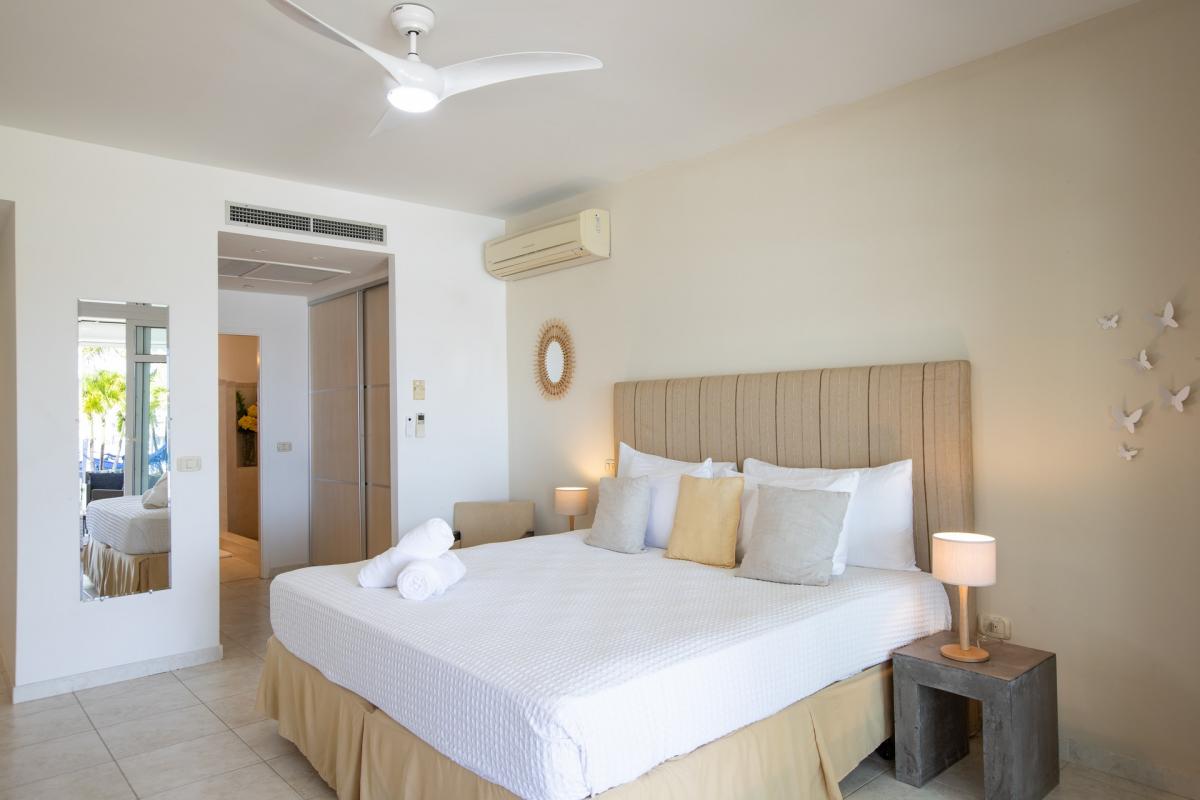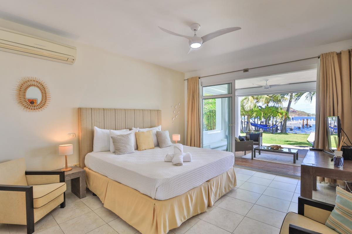 Bedroom 1: This room is equipped with a queen-sized bed, a lagoon view, a fan, air conditioning, a TV, and an ensuite bathroom.