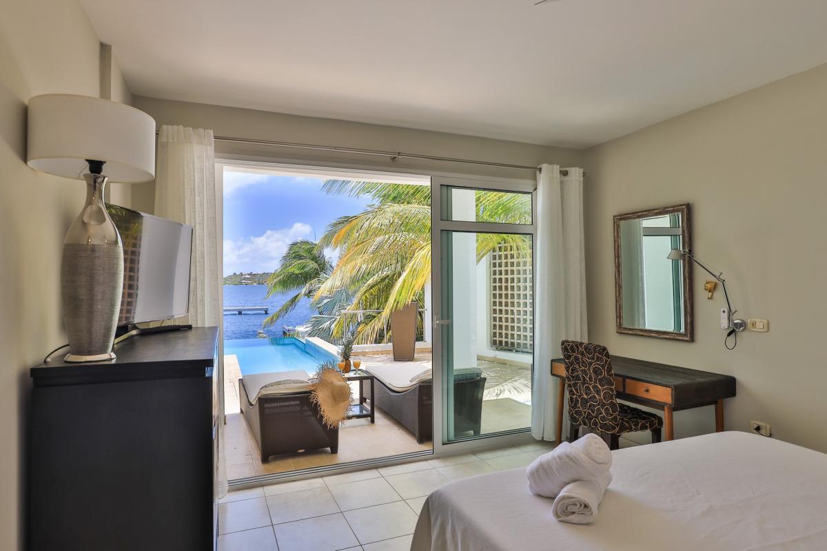 Bedroom 4: This room is equipped with a queen-sized bed, a lagoon view, a fan, air conditioning, a TV, and an ensuite bathroom.