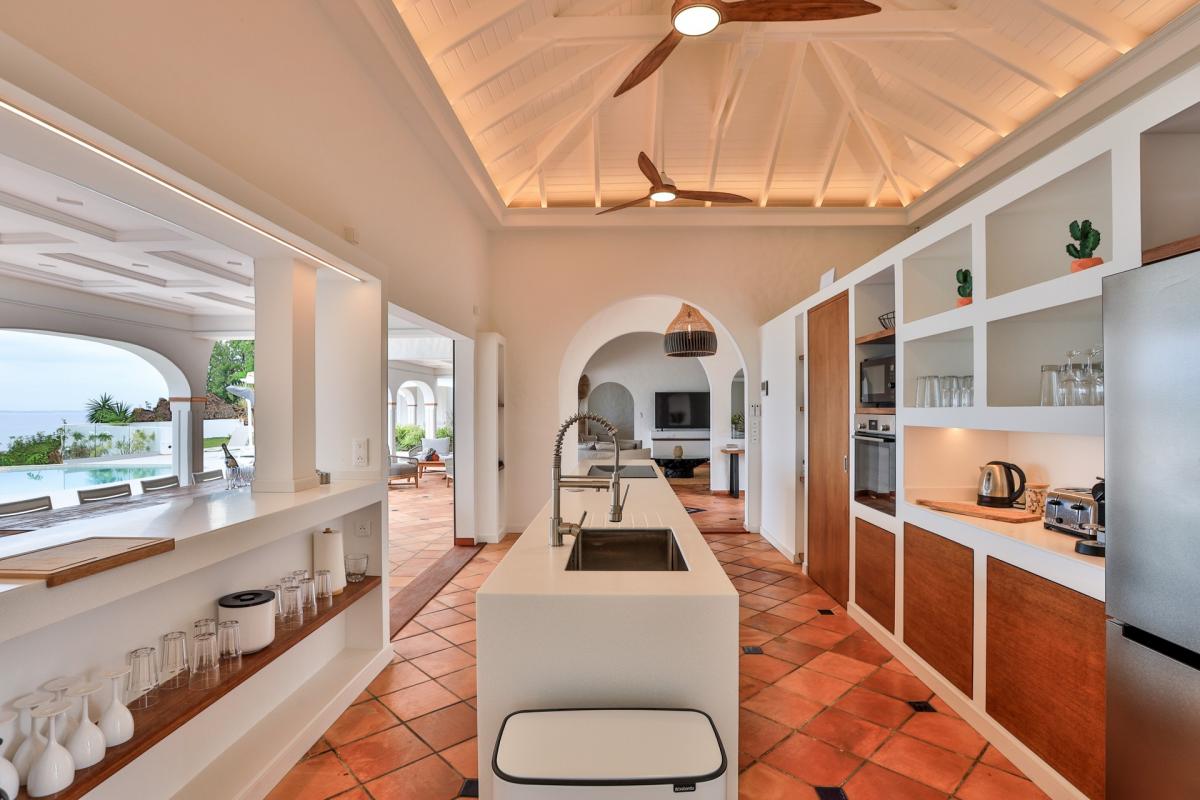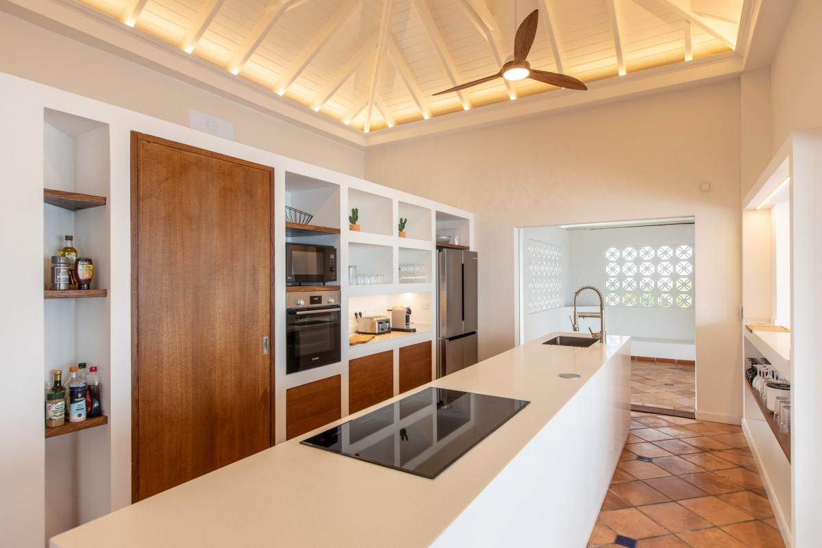 Spread across two levels, Villa Agama features spacious accommodations with five king-sized bedrooms, each equipped with refined en-suite bathrooms and smart TVs for added comfort. The main level houses three bedrooms near the open-concept kitchen and living room, while two additional bedrooms are located on the lower level, offering privacy and serenity. The living area, adorned with contemporary furnishings, exudes warmth and sophistication, perfectly complemented by a fully equipped kitchen that allows guests to prepare gourmet meals while taking in panoramic ocean views.