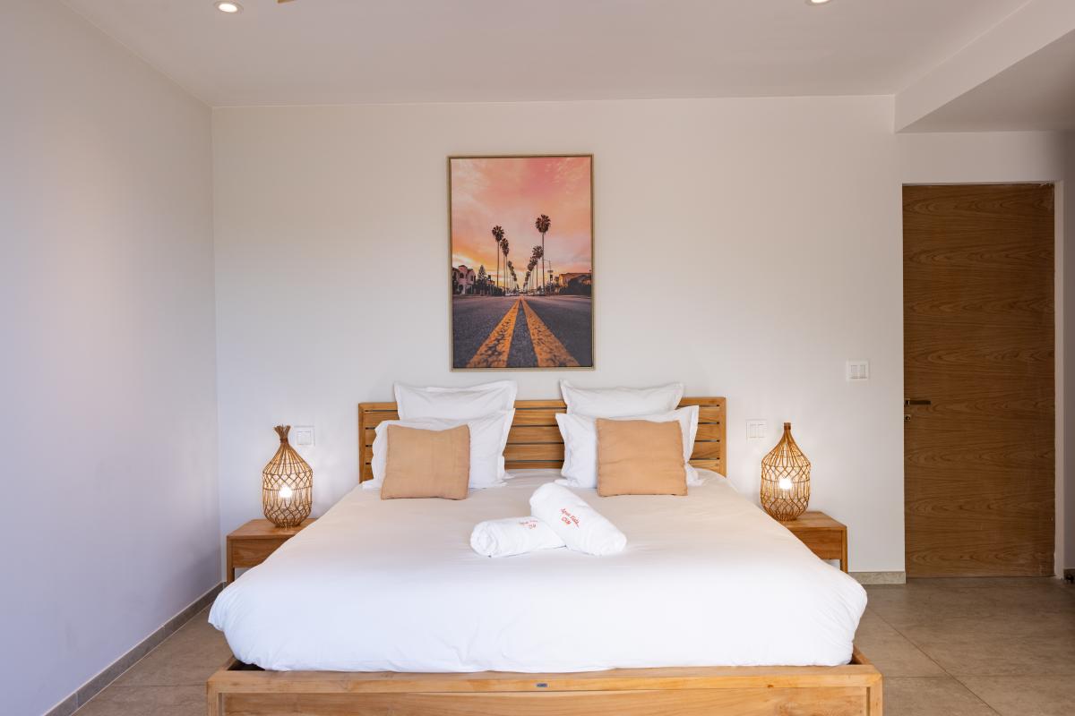 Bedroom 1: King-sized bed, an ocean view, air conditioning, a TV, a safe, and an ensuite bathroom.