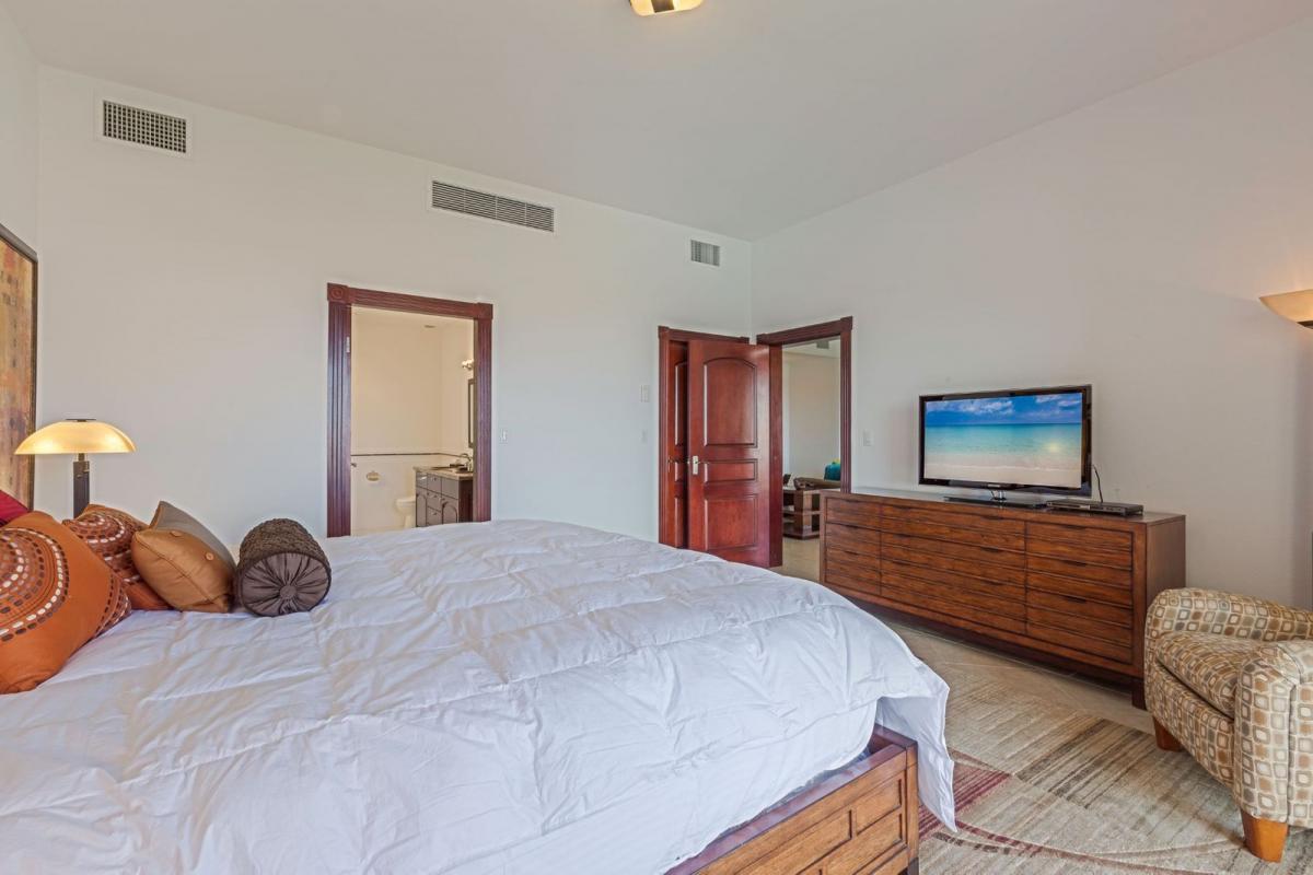 Primary Bedroom: Queen bed, TV, terrace access, en-suite bathroom