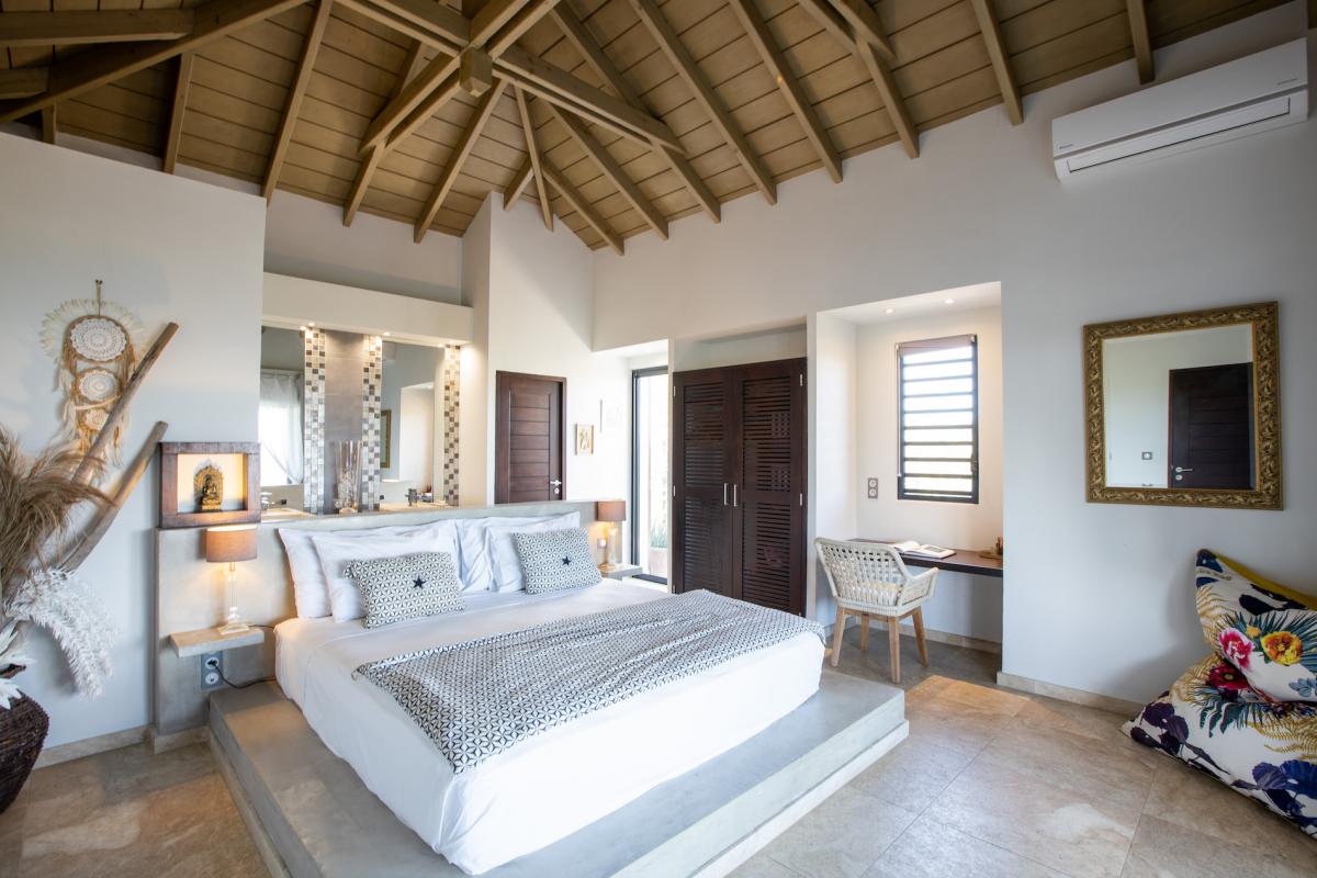 Bedroom 1: This room is equipped with a king-sized bed, an ocean view, air conditioning, a safe, and an ensuite bathroom.