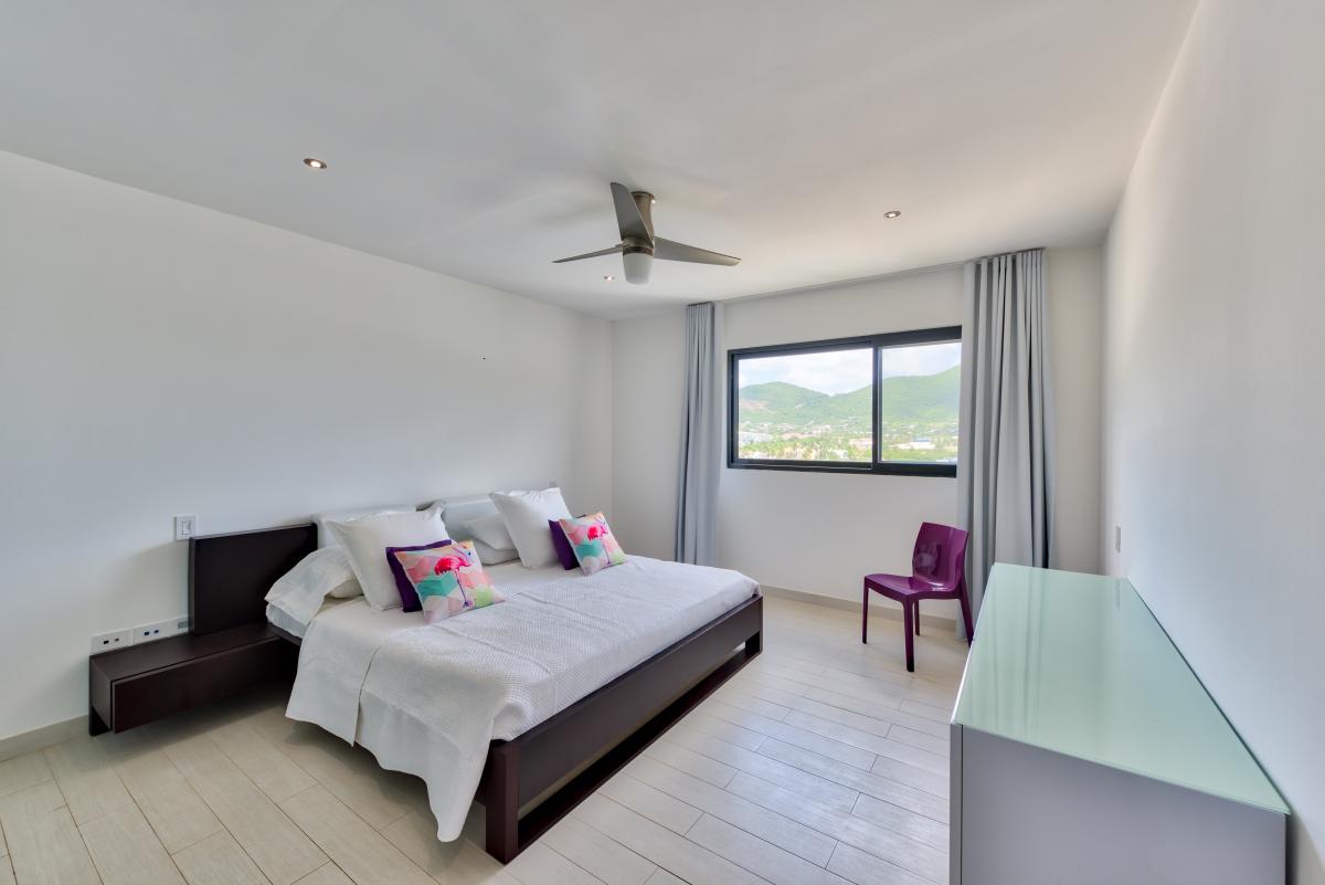 Bedroom 3: King bed, lagoon and yacht view, ceiling fan, 110V, ensuite bathroom with shower and hair dryer, safe