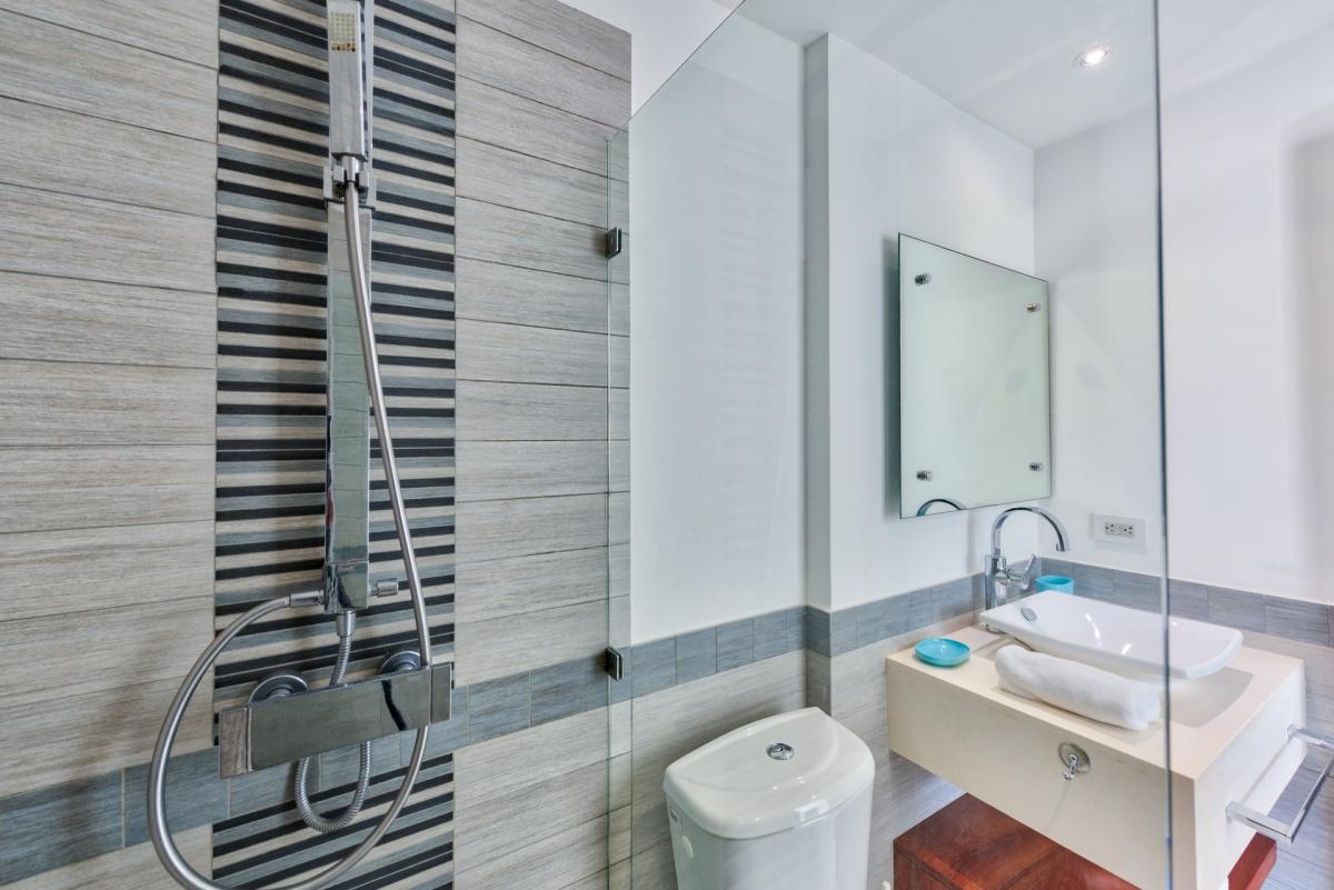 Bedroom 1: King bed, terrace and pool view, ceiling fans, 110V, ensuite bathroom with shower and hair dryer.