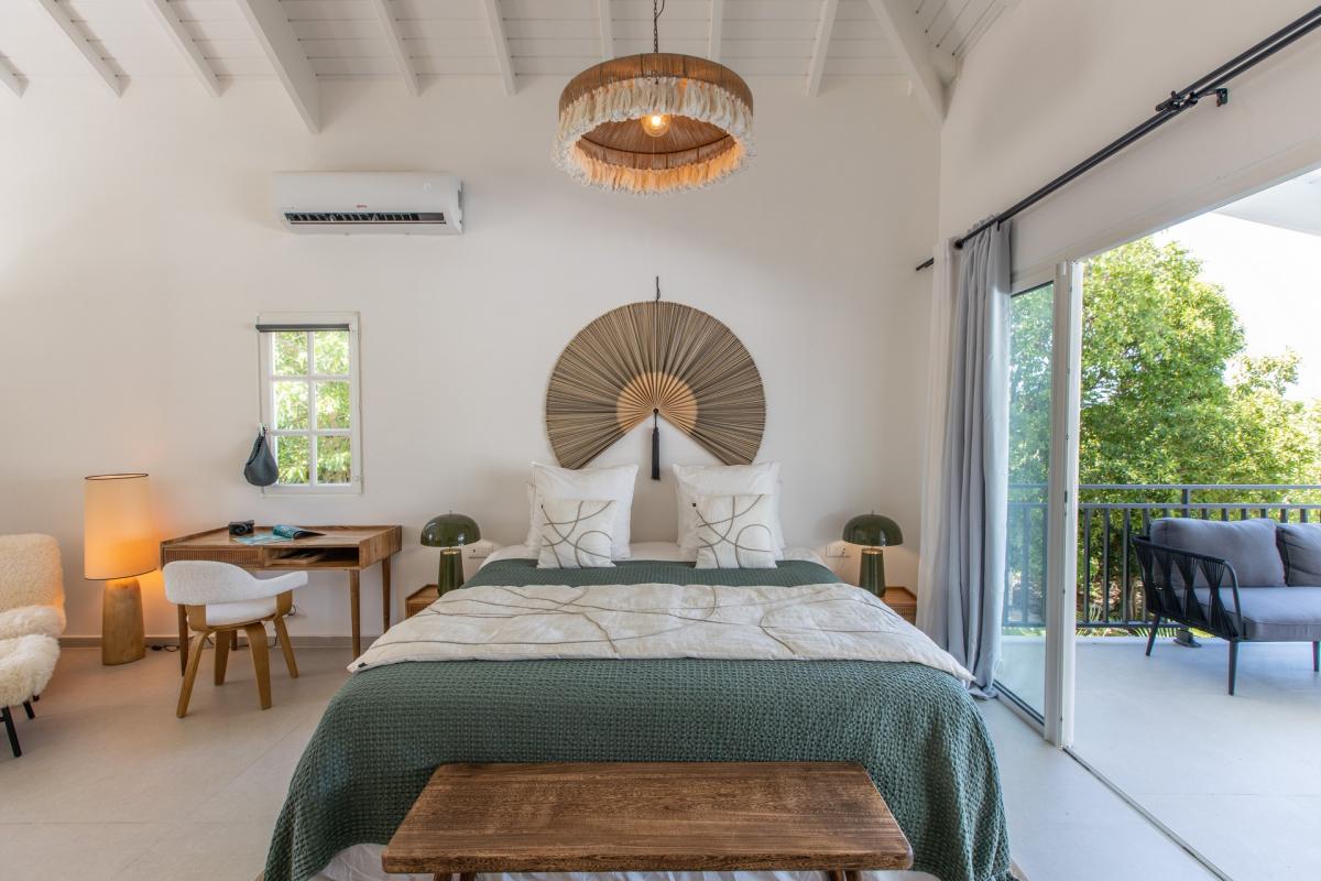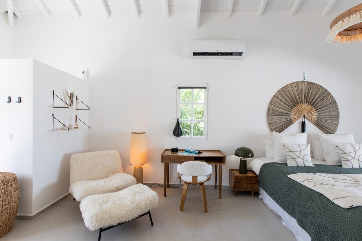 The main level of Villa Les Oliviers holds the primary bedroom with an ensuite bathroom. There are two additional bedrooms with ensuite bathrooms that overlook the pool. One of the bedrooms is accessible from inside the house, while the other is accessed from the terrace, allowing for a seamless blend of indoor and outdoor living. Guests can find the fourth bedroom on the lower level of Villa Les Oliviers. This room serves as a true sanctuary, with its private access through a small path next to the house, a private terrace, and a pond with koi fish.