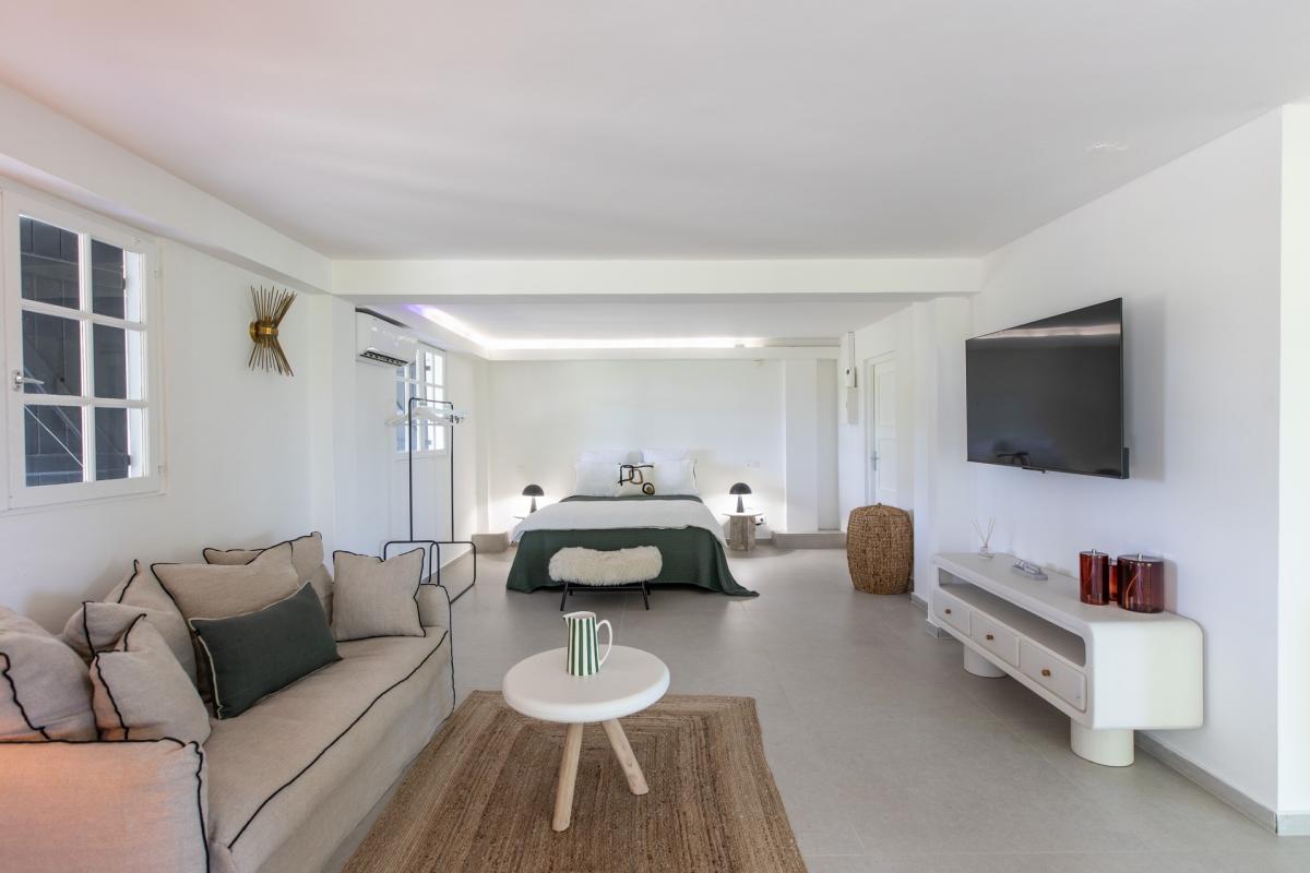 There are communal living spaces designed for comfort and privacy. At the heart of Villa Les Oliviers is a thoughtfully arranged double lounge. One lounge offers views of the pool from cozy seats, while the second entertains with a TV, making it a great place to hold a movie night.