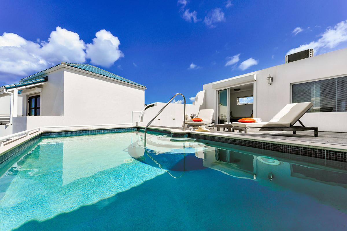 The third level offers access to the master bedroom with sea views and a roof top plunge pool complete with lounge chairs for your relaxing pleasure. The pool deck is the perfect spot to take in sunsets and moonrises – hence the name “Villa Luna”. The location of Villa Luna is perfect for every type of guest. Within a 5 minute walk (basically across the street) you’ll find Porto Cupecoy complete with gourmet grocery store, a great coffee and pastry shop, and some terrific restaurants. Within 3 minute drive you’ll find the Atlantis Casino again with some terrific restaurants. And, as mentioned above, within a 5 minute drive you will find Mullet Bay Beach, Plum Bay Beach, Long Bay Beach, and Baie Rouge. Come and enjoy all that St. Martin and Sint Maarten have to offer at Villa Luna. Can be rented as a 1-2 or 3 bedroom villa.