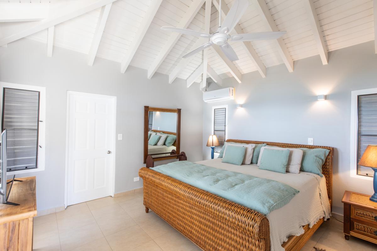 Bedroom 1: This room is equipped with a king-sized bed, an ocean view, a fan, air conditioning, a TV, and an ensuite bathroom.