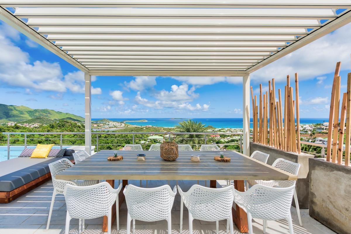 Welcome to Villa Turquoze, a contemporary retreat offering breathtaking views of the turquoise sea and the islands of Pinel and Tintamarre. This luxurious St. Martin villa features four bedrooms and four bathrooms, providing ample space and comfort for your stay.