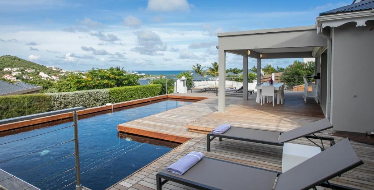 Villa Z'Abricot is a modern home located in Orient Bay in St. Martin. This gorgeous St. Martin villa has six bedrooms, four bathrooms, a gym, a barbecue area, a pool, and a bocce ball court. The villa is only five minutes by car from the beaches and activities in Orient Bay.