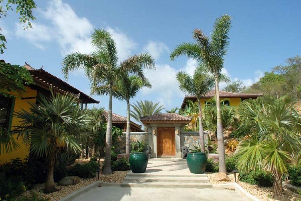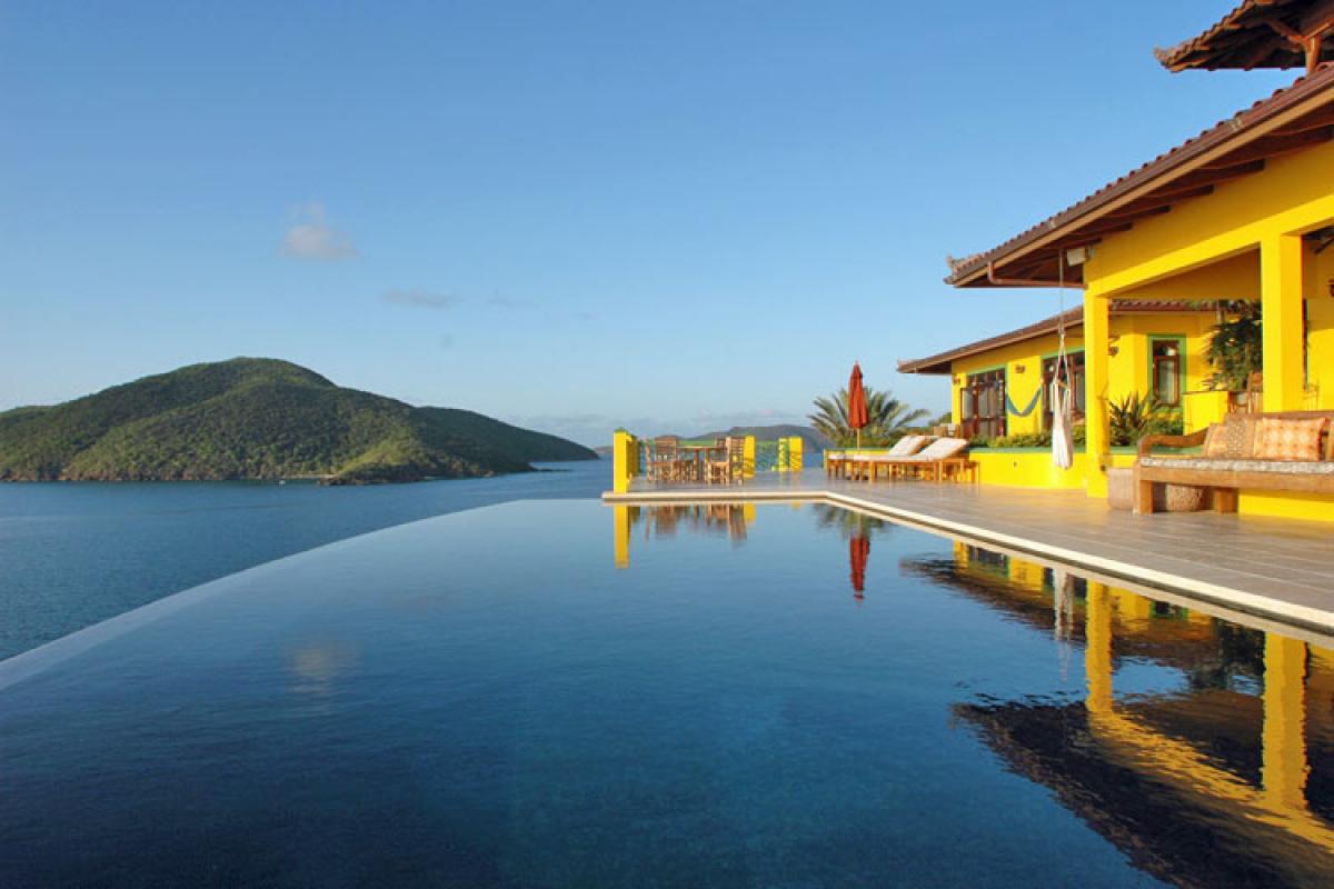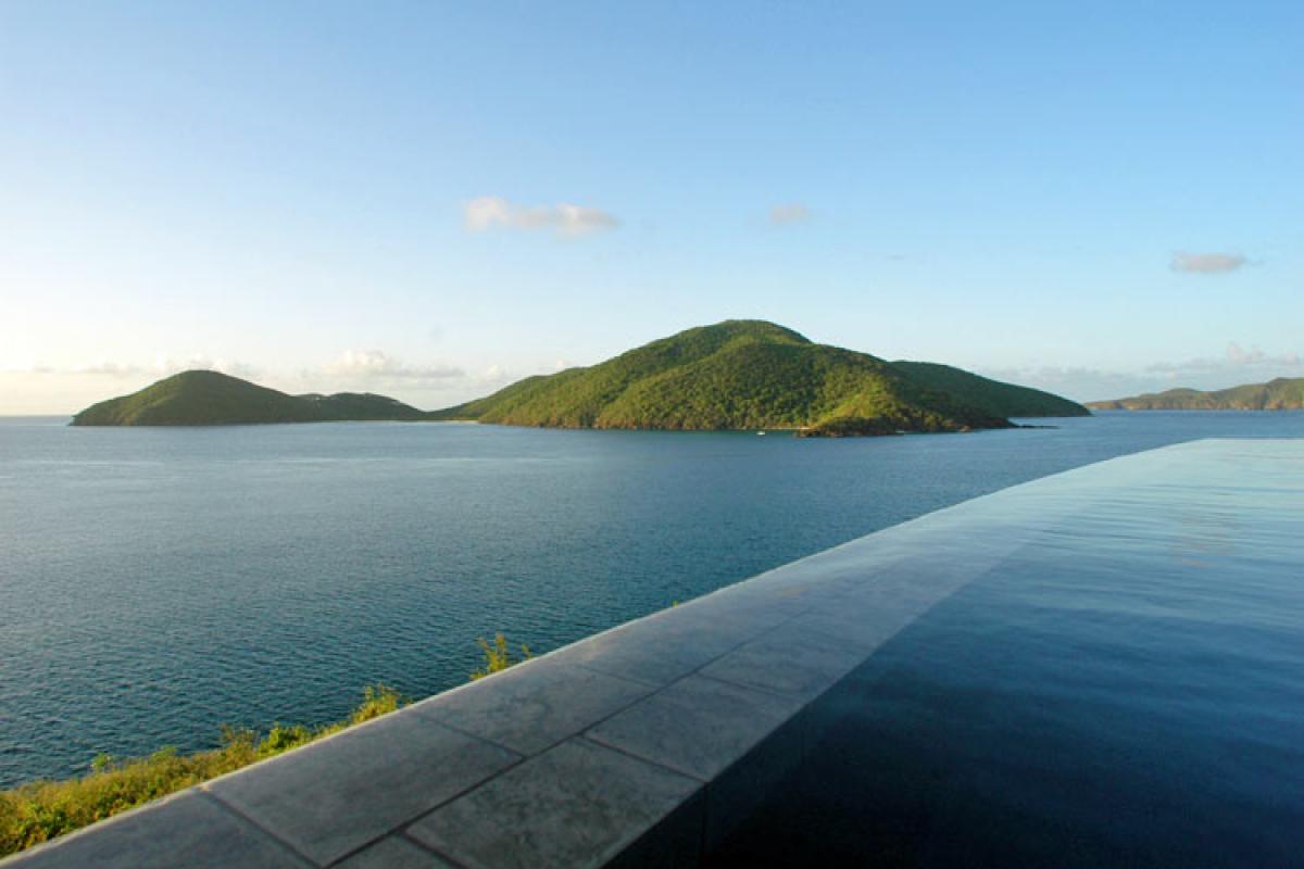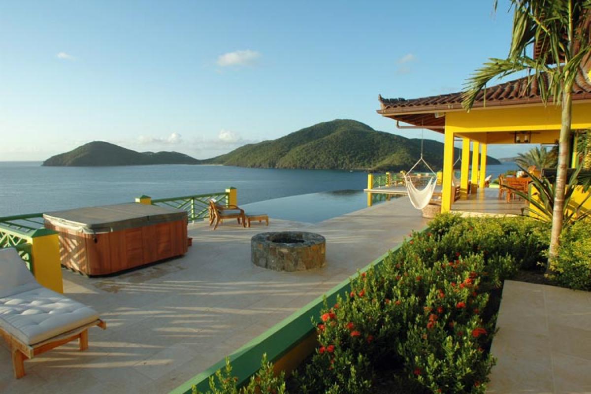Golden Pavilion Villa is a unique property, unparalleled in Tortola. The villa presents zen tranquility and privacy, juxtaposed with modernity and meticulous details. Walking gardens, paths leading to sunken stone retreats, and sitting areas are nestled under mature plantings at cliff’s edge. Tropical birds ride warm breezes up the cliff to sip from the infinity pool. Turtles, rays, and the occasional whale can be seen from the deck. Breathtaking views complement the highest building standards with imported granites, marbles, fittings, appliances, and furnishings; Golden Pavilion Villa comforts the eye and soothes the soul. Privately situated on four gated acres, this brand new 5000 square foot, Balinese inspired villa with four bedrooms, a one bedroom guest cottage, and four and a half baths, features stunning 180 degree ocean views, a heated infinity pool, a hot tub, an outdoor gas fire pit, a second floor gallery with wet bar and pool table, a media room with a large flat screen TV and surround sound, an office with fax/pc/wireless internet, a fully equipped gym, air conditioning in all primary rooms, and a private chef. Traditional Indonesian sculptures, art, and furnishings fill the public spaces and the villa is decorated with a refined, distinctly British-Colonial flair. All bedrooms are elegantly appointed with imported four poster beds, exotic fabrics, and heavy black out draperies. Boating excursions on our 29’ fishing/ski boat, and spa services are also available. The centerpiece and one of the defining features of Golden Pavilion Villa is the heated infinity pool. Majestically centered on the ocean facing deck, with views east, north, and west, the 20 x 40’ pool will be your daily focus. Overlooking the pool and the views beyond, is the 16’ carved Balinese dining table with seating for 10. Additional cocktail seating for 8 is available poolside for breakfast, afternoon tea, or after dinner drinks. Located on the east end of Tortola, Golden Pavilion Villa is a 7 minute walk from secluded Little Bay Beach and a 15 minute drive to Road Town. Direct ocean access is available from the property for the adventuresome.