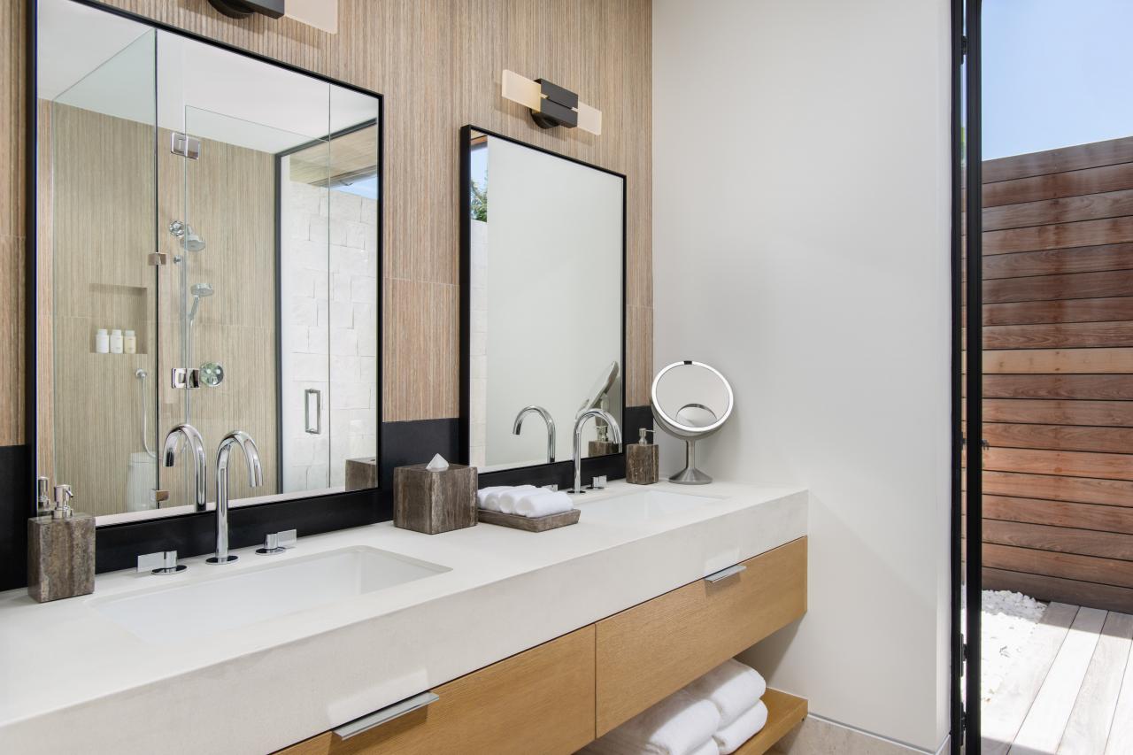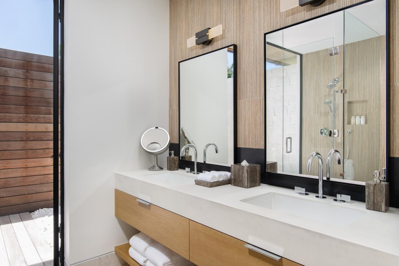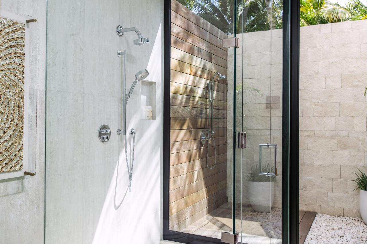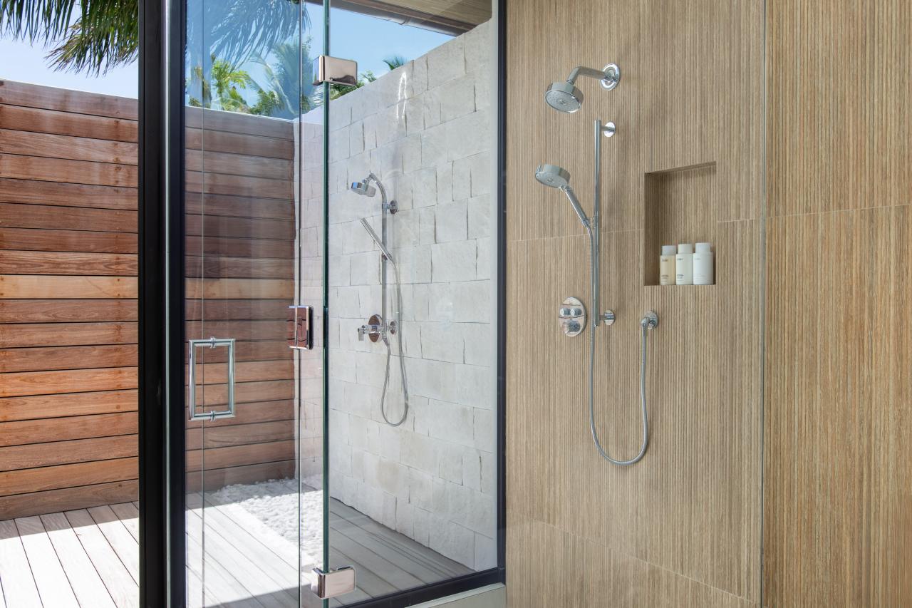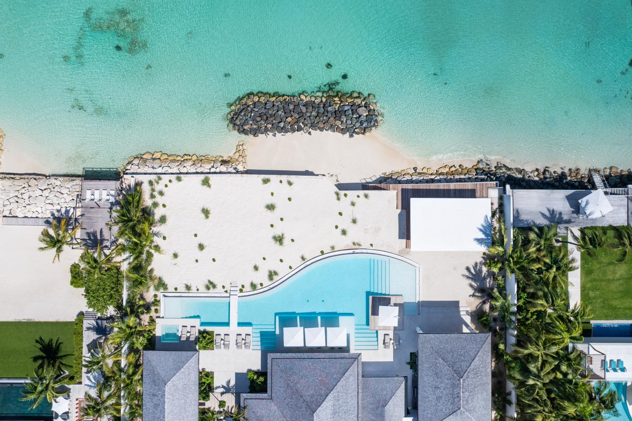 Just steps above the white sands, the expansive terrace is the heart of outdoor living, centered around an oversized infinity-edge pool with a tanning ledge, hot tub, and daybeds perfect for lounging under the Caribbean sun. Guests can dine alfresco, unwind by the firepit, or enjoy evening games on the floodlit pickleball and half-basketball court. Despite its proximity to the beach, the property offers a feeling of complete seclusion, enhanced by thoughtful design that maximizes both comfort and style.