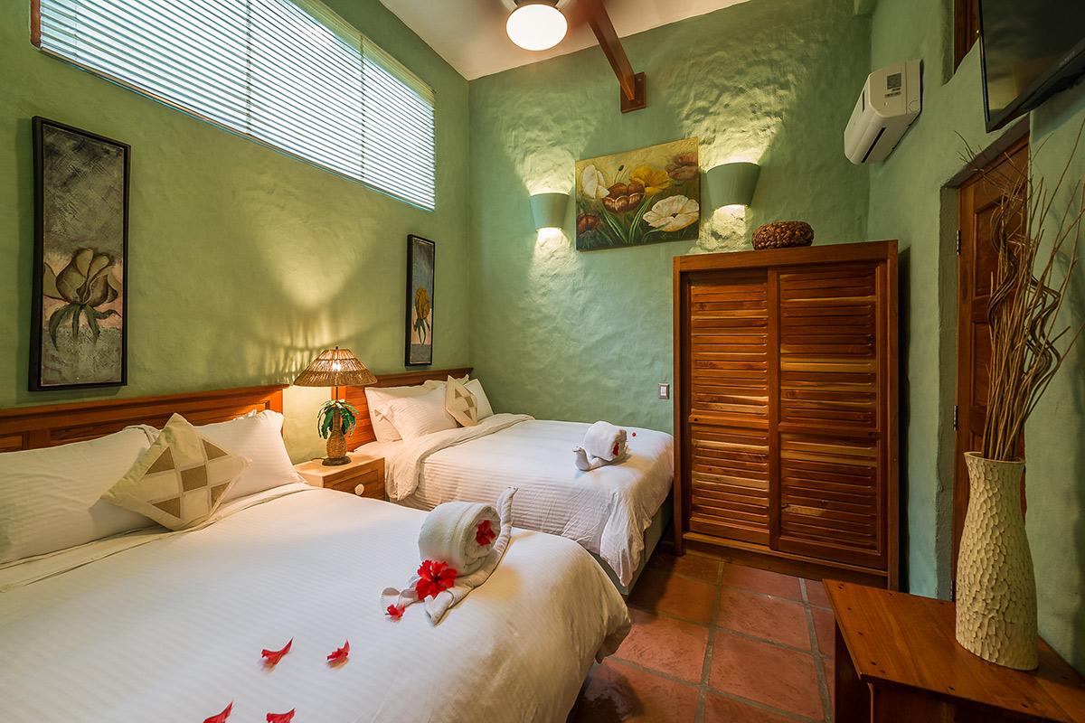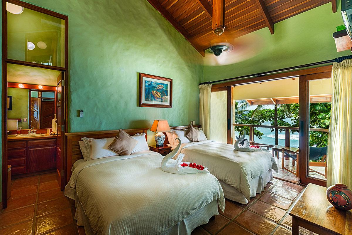 - Bedroom 6: Two Queen beds, en suite bathroom with jacuzzi, AC, ceiling fan, phone, satellite TV, balcony, ocean view, located on the second floor