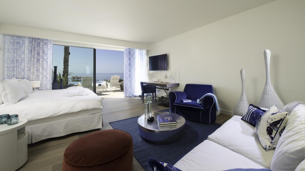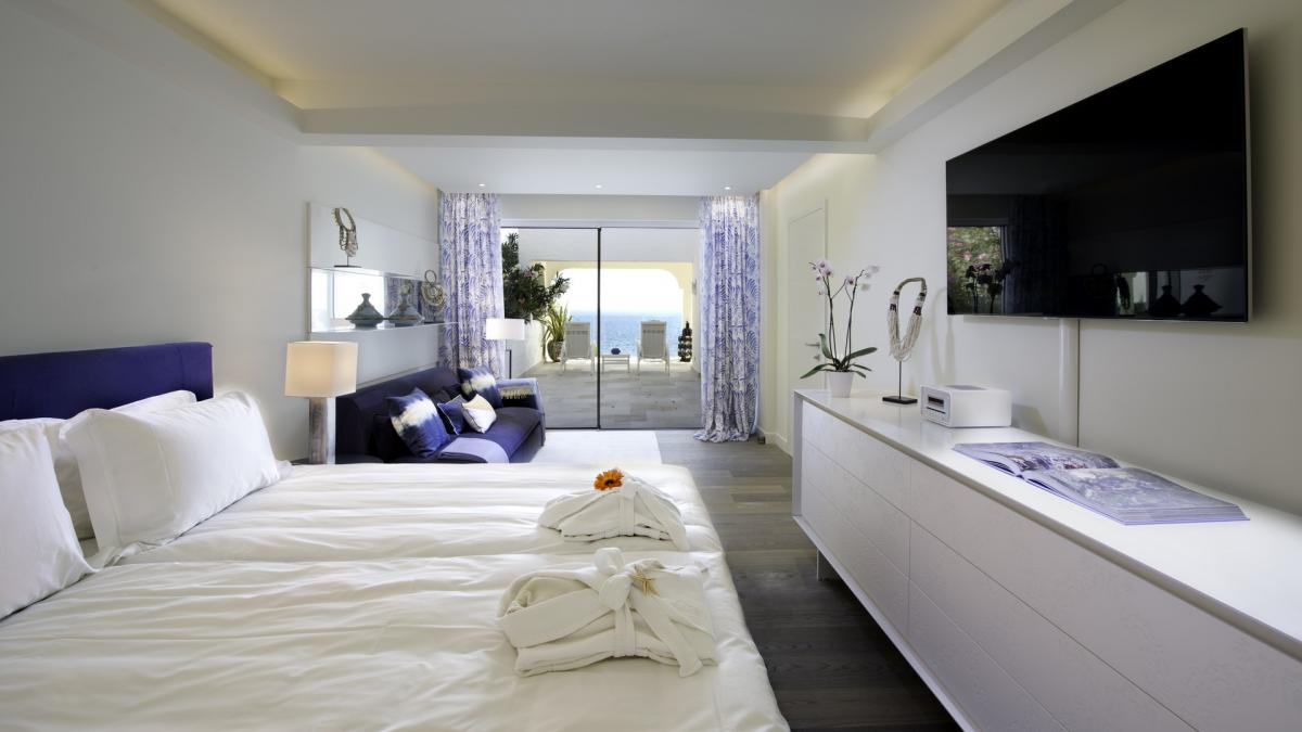 Upper floor bedroom 5: King-size bed. Large room with living area and access to private terrace. En-suite bathroom with tub and shower. Offers outstanding ocean views.