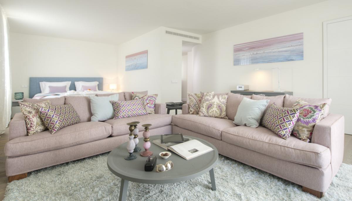 Upper floor bedroom 4: King-size bed. Large room with living area and access to shared terrace. En-suite bathroom with tub and shower. Offers outstanding ocean views.