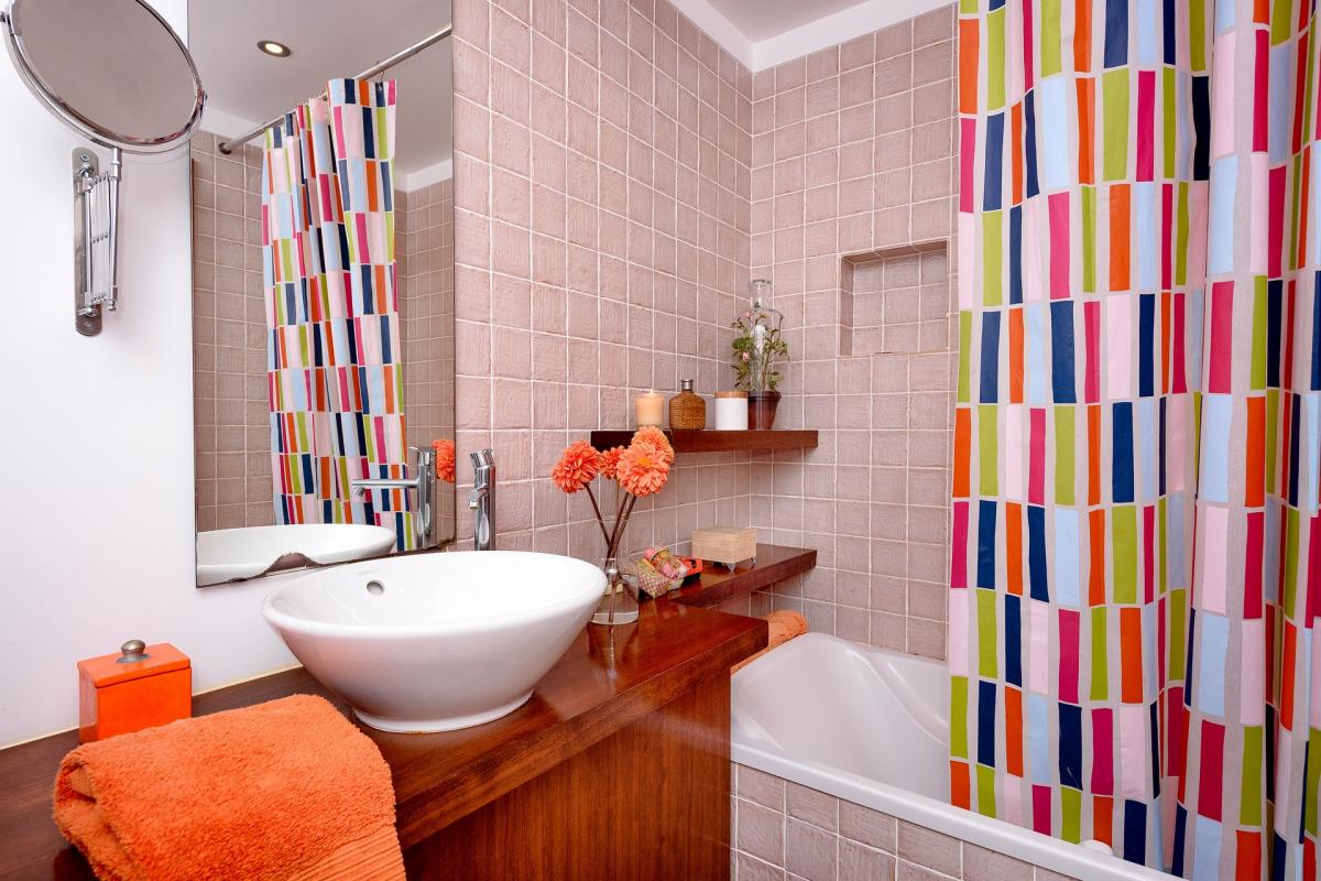 Bathrooms are clean and bright with fun, coloured-tiled walls and funky shower curtains.
