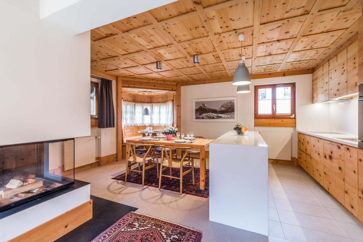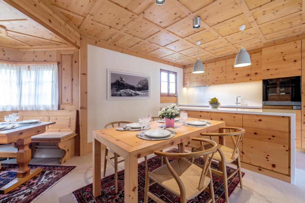 Immediately upon entry into the first apartment, guests are greeted by a beautiful light filled dining and kitchen area. The dining area has a square table with seating for four, and a beautiful curved window nook with table and seating for six, and gorgeous views of the slopes.