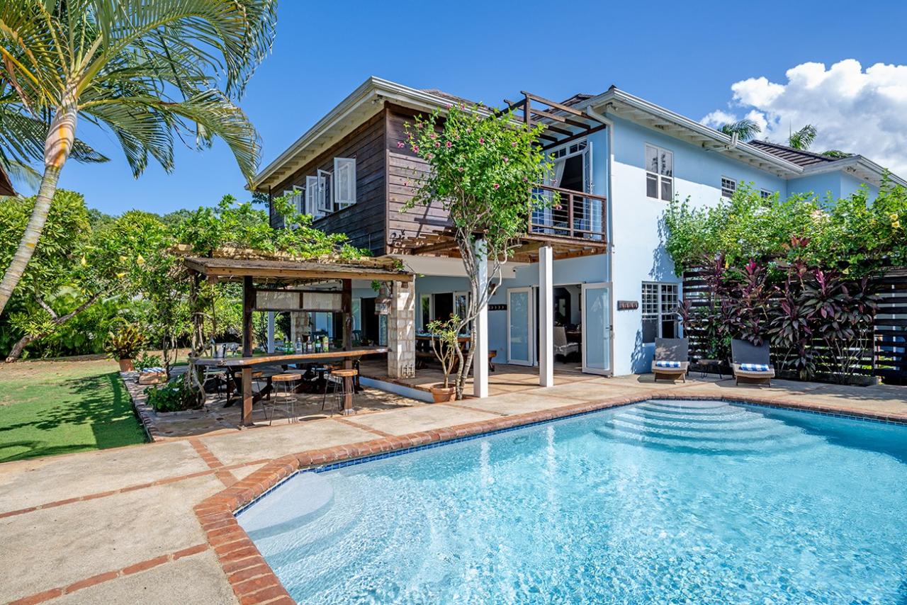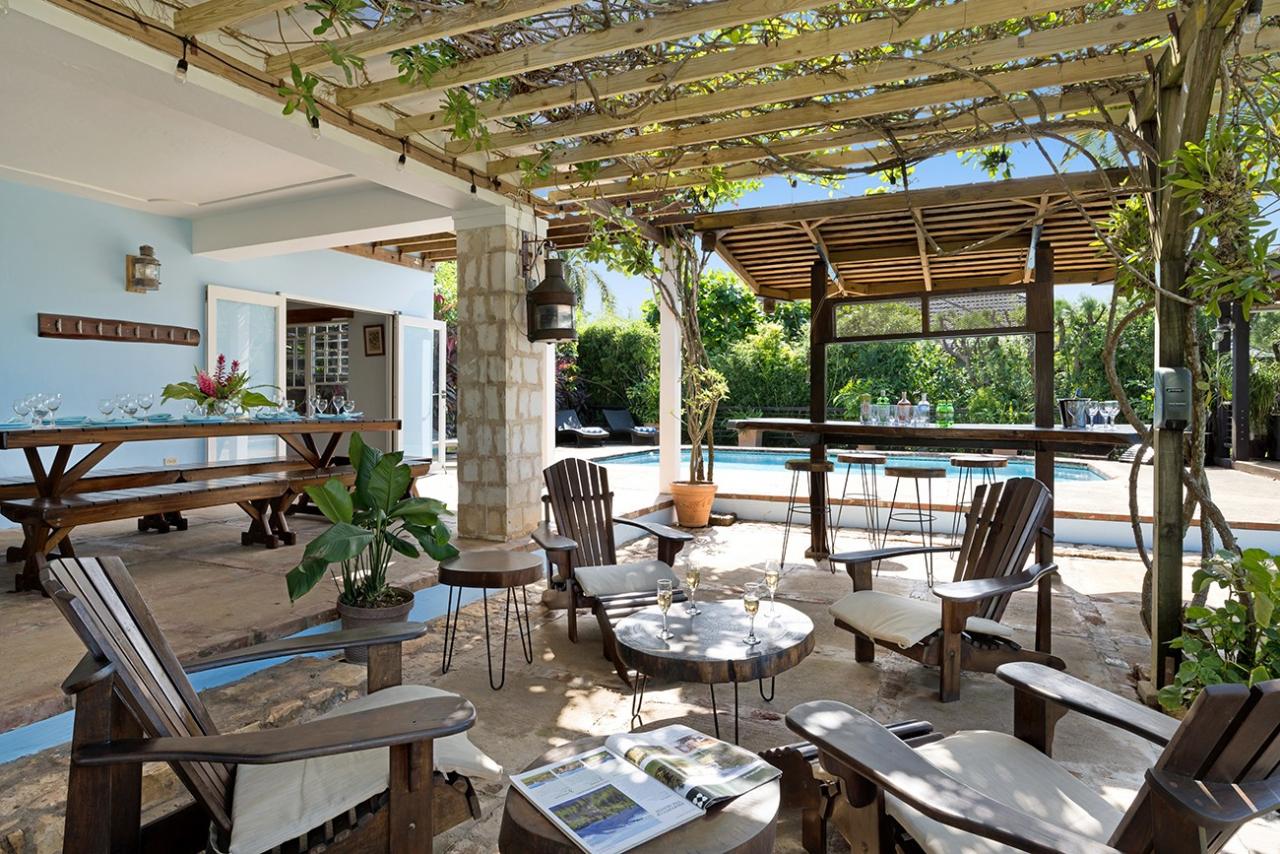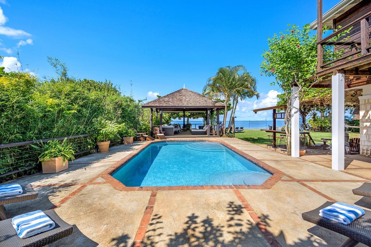 Sleepy Shallows is a beautiful villa in Jamaica. This Jamaica vacation rental sits on a grassy lawn that stretches down to the white sandy beach and the waters of Bengal Bay. Sleepy Shallows gives guests a place to embrace outdoor living with multiple places to sit and relax, read a book, or enjoy with friends and family. On the ground level, there is one bedroom, and there are four more bedrooms and a game room equipped with a TV and a pool table. There is plenty of seating and dining areas along with a gazebo near the pool with sofas and a hammock to enjoy the beachfront. Enjoy the white sand beach of Sleepy Shallows.