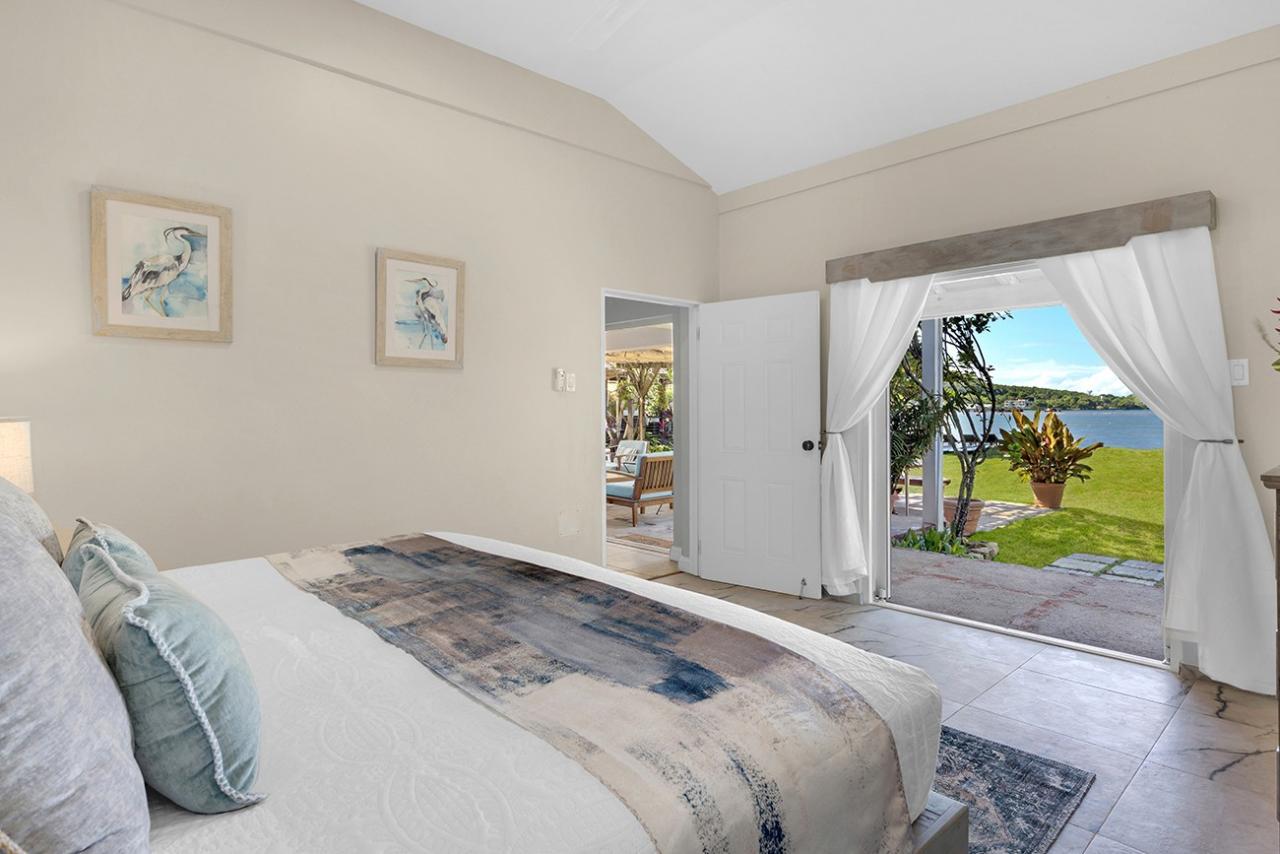 Bedroom 1: This room is located on the ground floor. It has a king-sized bed, a closet, and French doors that open to a lawn terrace and sea view. Bedroom 1 also has an ensuite bathroom equipped with oversized single vanities, a separate toilet, and a walk-in rain shower.