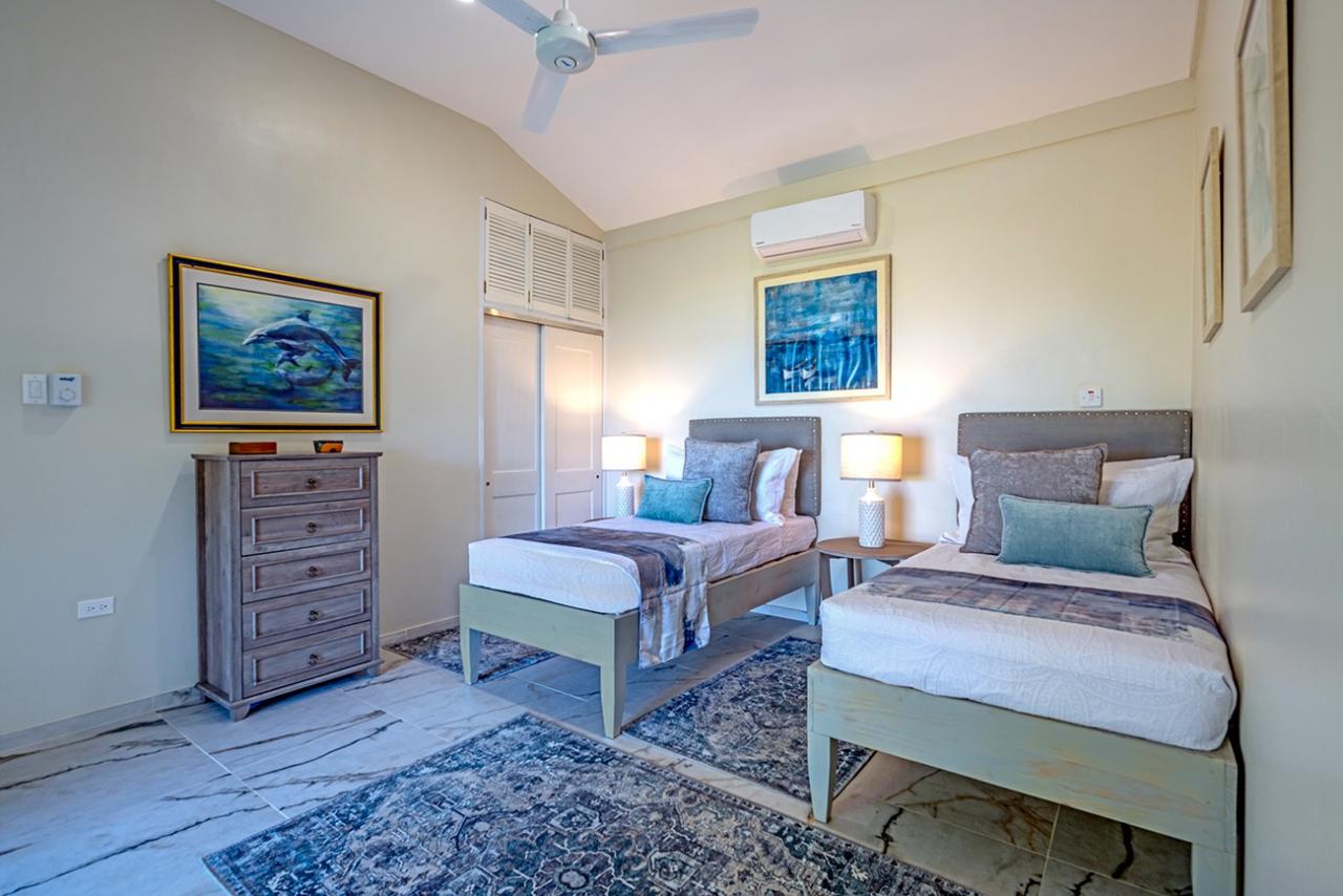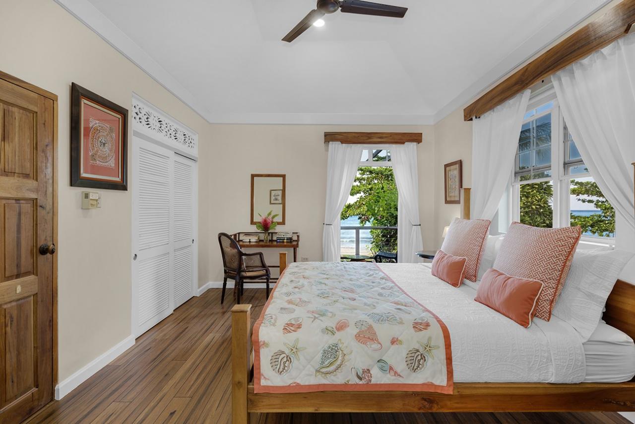 Bedroom 2: This room is located on the upper level. It has a king-sized bed, a closet, and French doors that open to a private balcony with a sea view. Bedroom 2 has an ensuite bathroom with double vanities and a large walk-in rain shower.