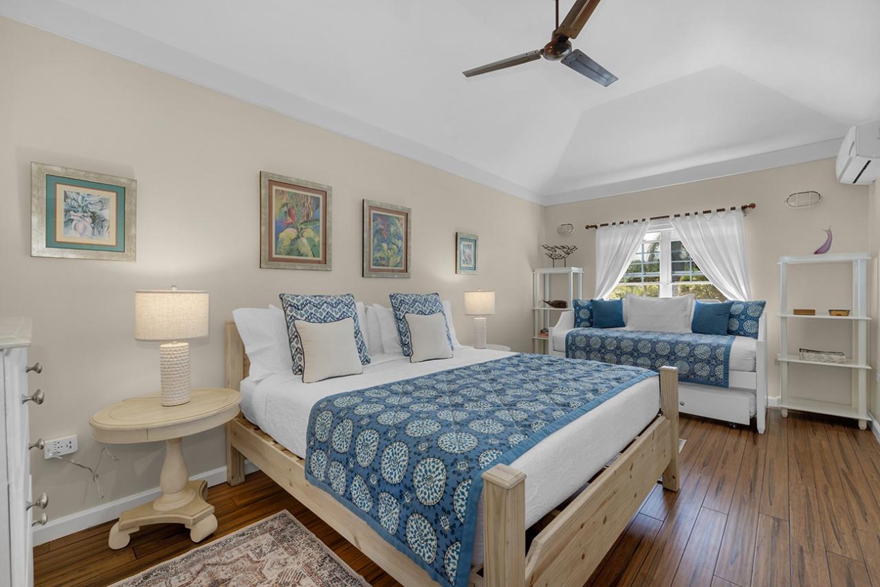 Bedroom 3: This room is located on the upper level. It has a king-sized bed, a closet, and French doors that open to a private balcony with a sea view. Bedroom 3 has a small ensuite bathroom with a shower and single vanity.
