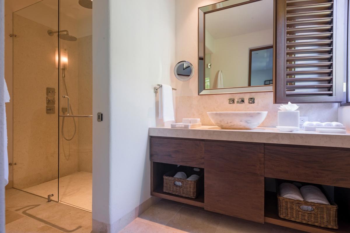 Primary Bedroom 1: King bed, ensuite bathroom with outdoor showers and bath