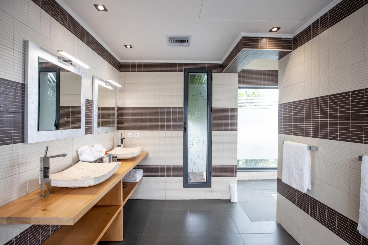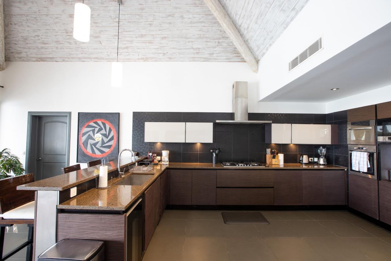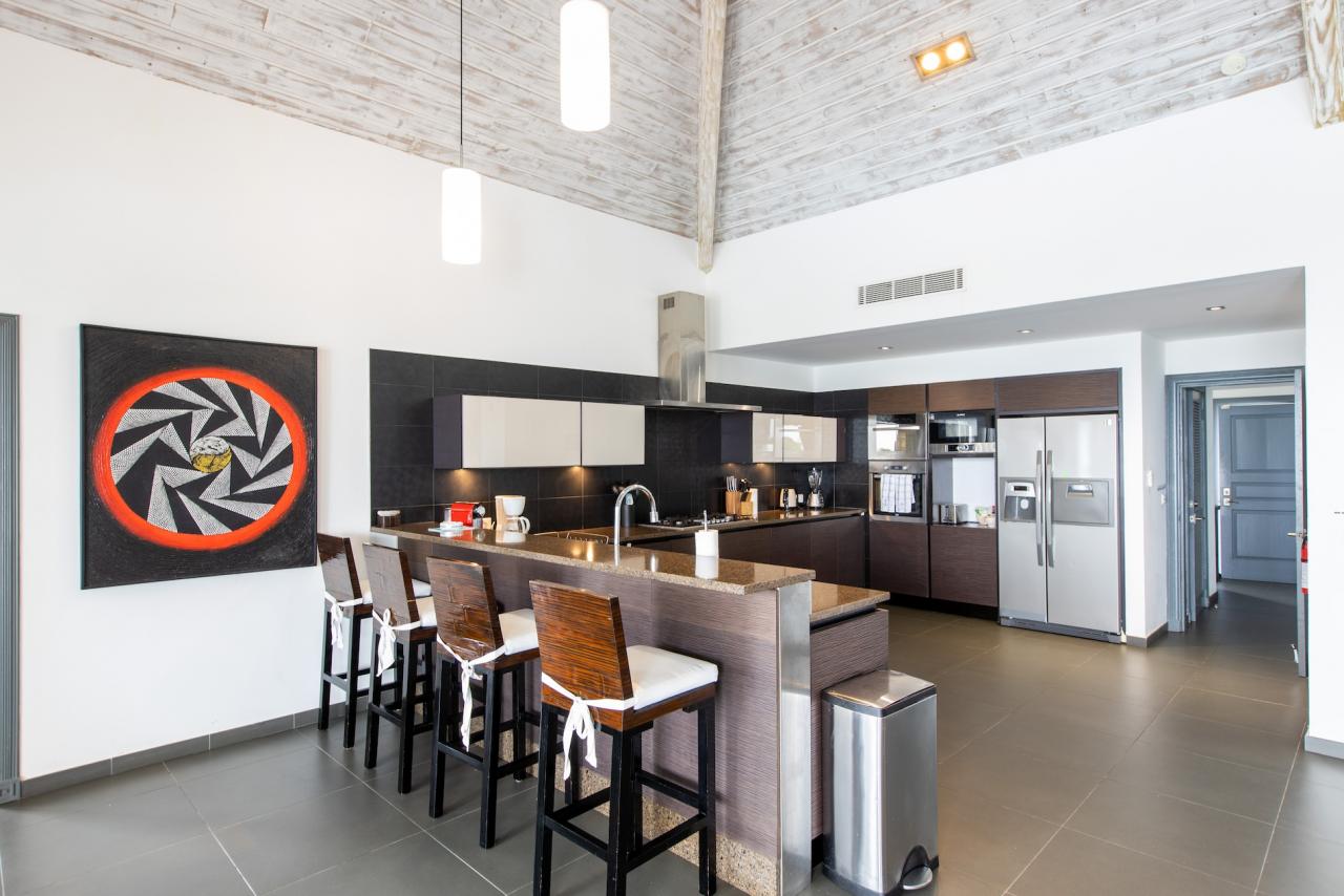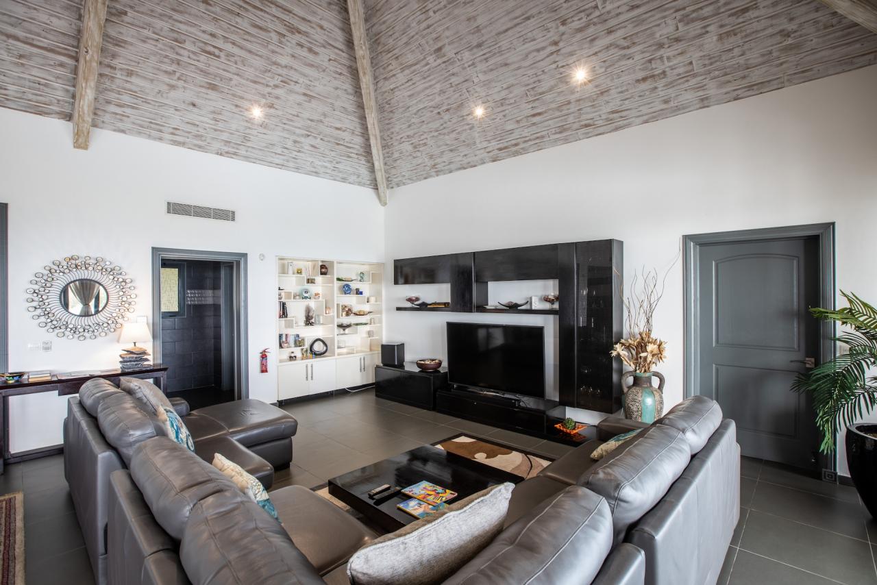 Guests are greeted by a spacious and gorgeous furnished living area once through the grand entrance. The living area through this entrance has an open-concept layout that brings in natural light to provide guests with a warm and inviting atmosphere. An expansive terrace overlooks the stunning Caribbean Sea through the living area. The living room and each of the four bedrooms open onto the pool terrace.